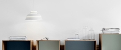 Die Concert Pendelleuchte aus dem Jahr 2005 besteht aus vier Metallschirmen und einer Parabel, die an einer säurebehandelten Glasaufhängung montiert ist. So wird das Licht gleichmäßig und angenehm zwischen den Schirmen verteilt, ohne zu blenden, egal in welcher Höhe die Pendelleuchte hängt.
