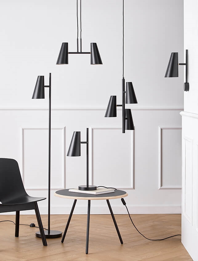 Die Cono-Serie ist auch als Wandleuchte, Stehleuchte, Tischleuchte und als Pendelleuchte mit zwei Schirmen erhältlich.