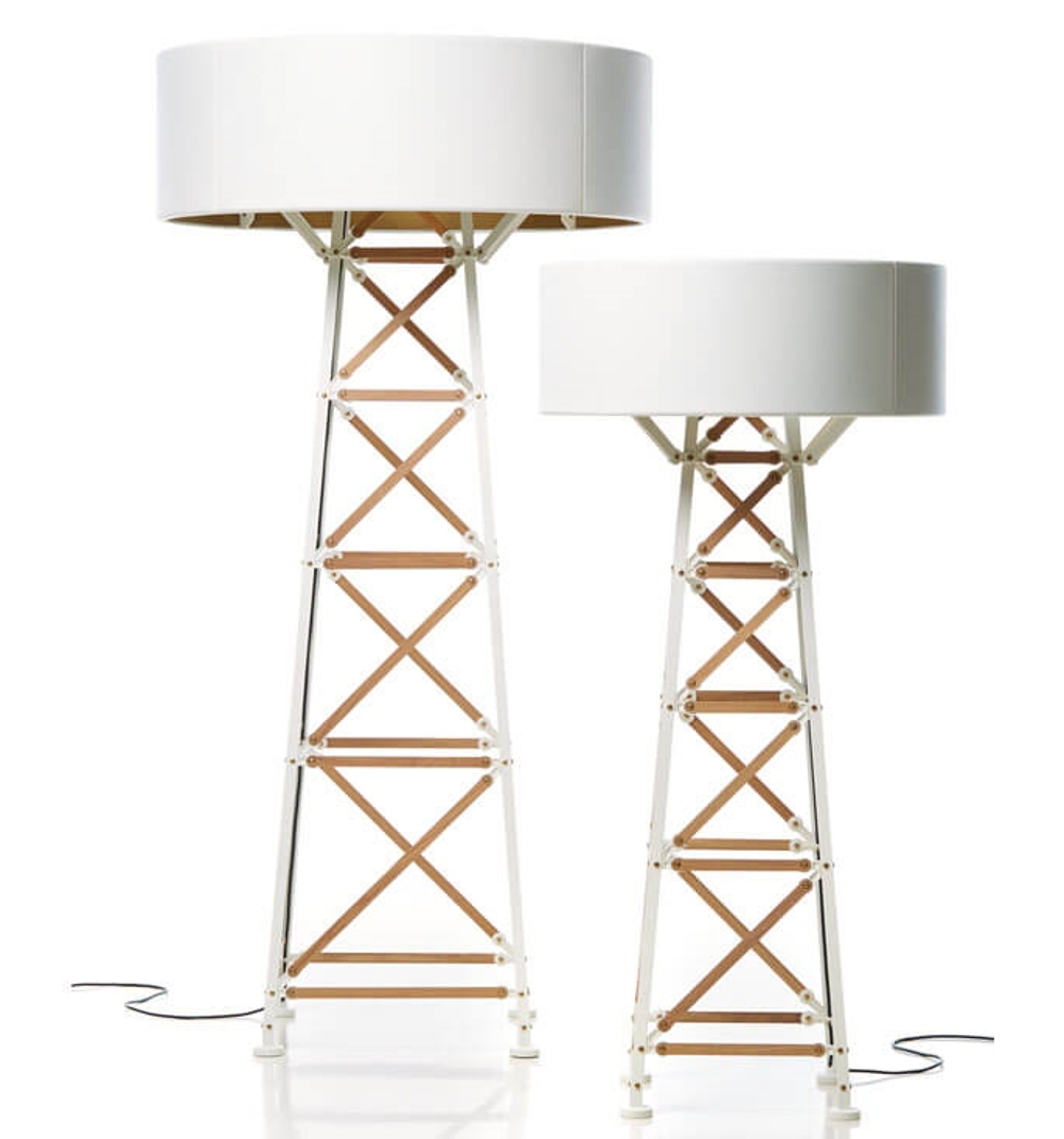 Construction ist als Stehleuchte und Pendelleuchte in 2 Größen in Schwarz oder Weiß/Holz erhältlich.