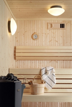 Solhem Sauna Saunaleuchte ist in den Farben Weiß, Grau und Braun erhältlich. Die Contrast-Serie umfasst neben Solhem Sauna auch Fridhem Sauna.