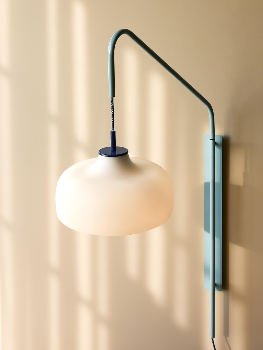 Current Wandleuchte besteht aus einer blauen Basis und einem weißen Opal-Schirm aus Glas.