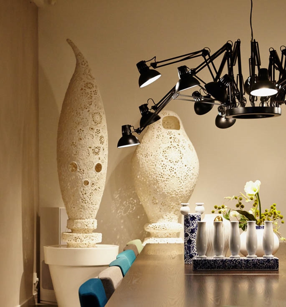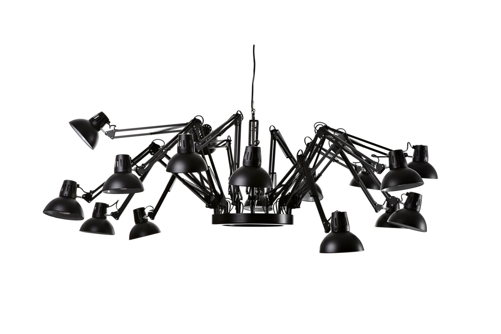 Die Pendelleuchte besteht aus 16 Architektenlampen, die an derselben Halterung montiert sind - und wird so zu einer modernen Variante des klassischen Kronleuchters - mit dem Aussehen einer Spinne.