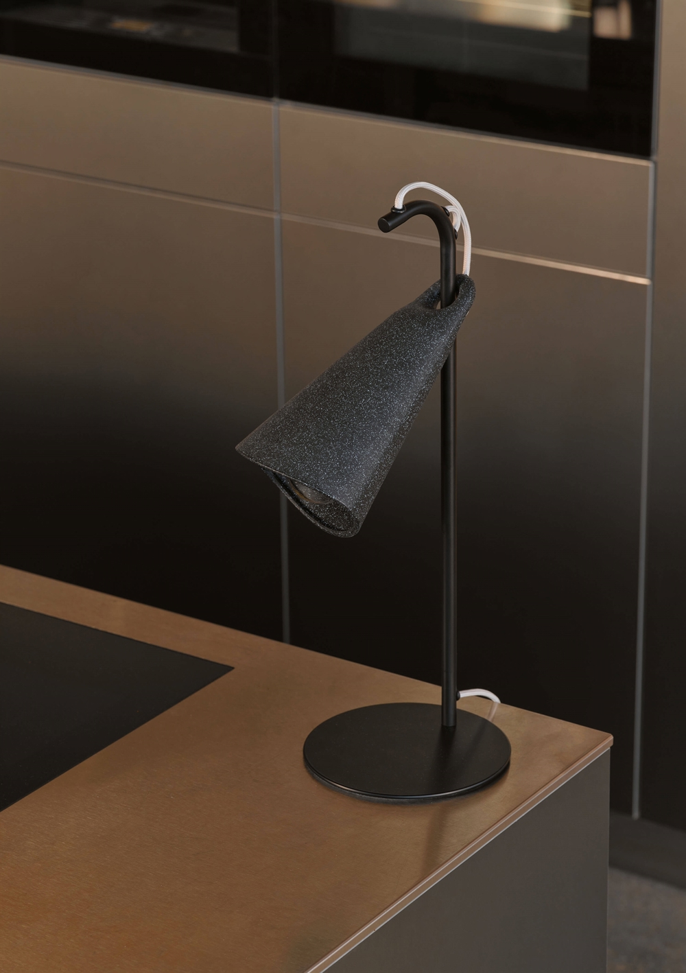 Die zeitlose Tischleuchte Decor Bell in Schwarz, hergestellt aus Stahl mit einem Schirm aus recyceltem Polyethylen, ist eine ideale Wahl als Lampe für den Schreibtisch, Nachttisch, das Regal oder als Beistelllampe neben dem Sessel. Die Position des Schirms kann verändert werden.