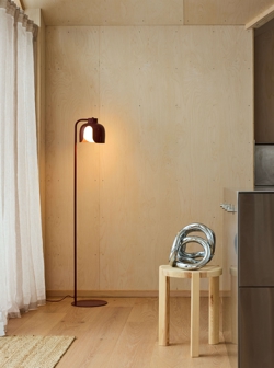 Die Stehlampe ist in mehreren Farben mit passendem Stoffkabel erhältlich.