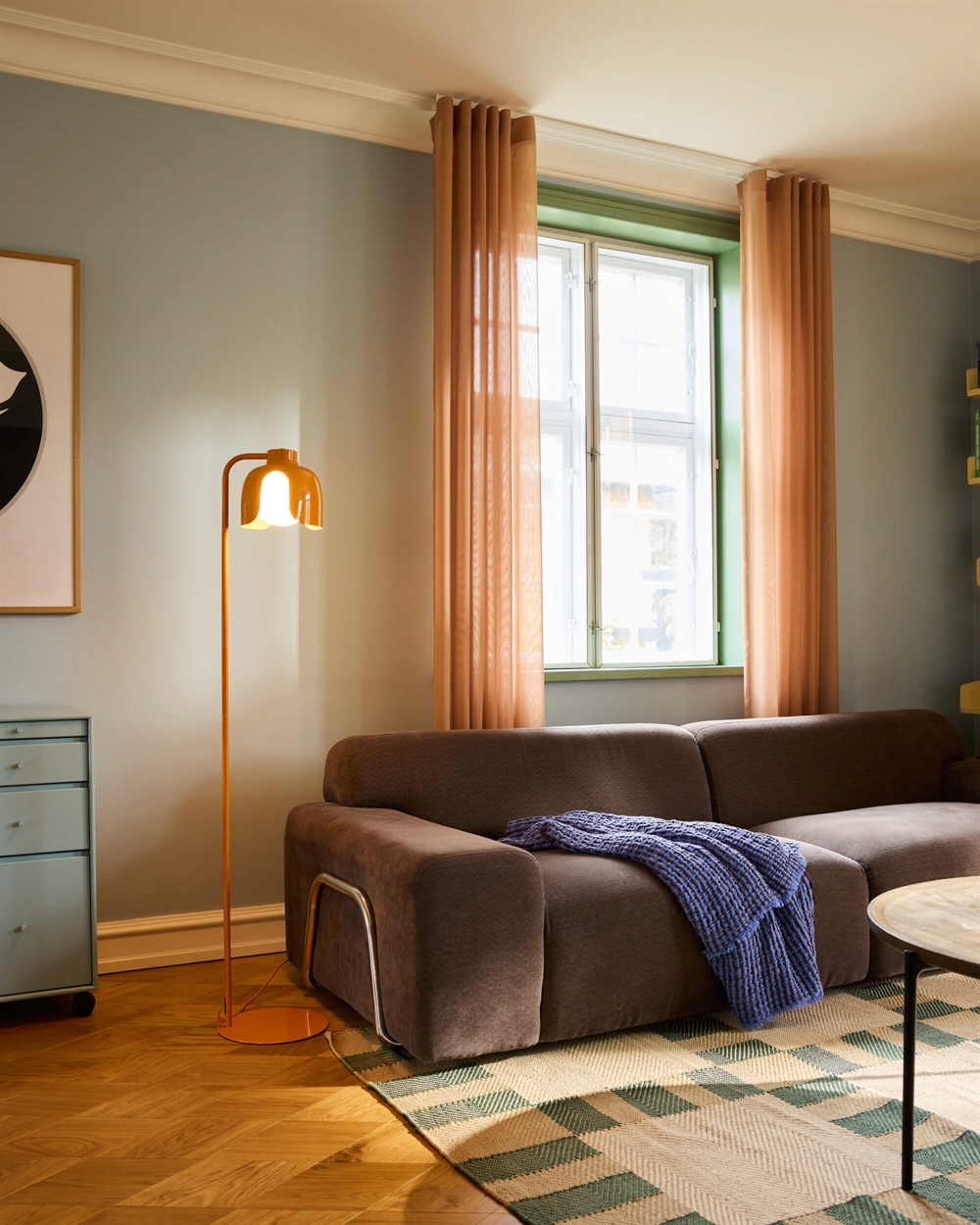 Die Stehlampe ist in mehreren Farben mit passendem Stoffkabel erhältlich.