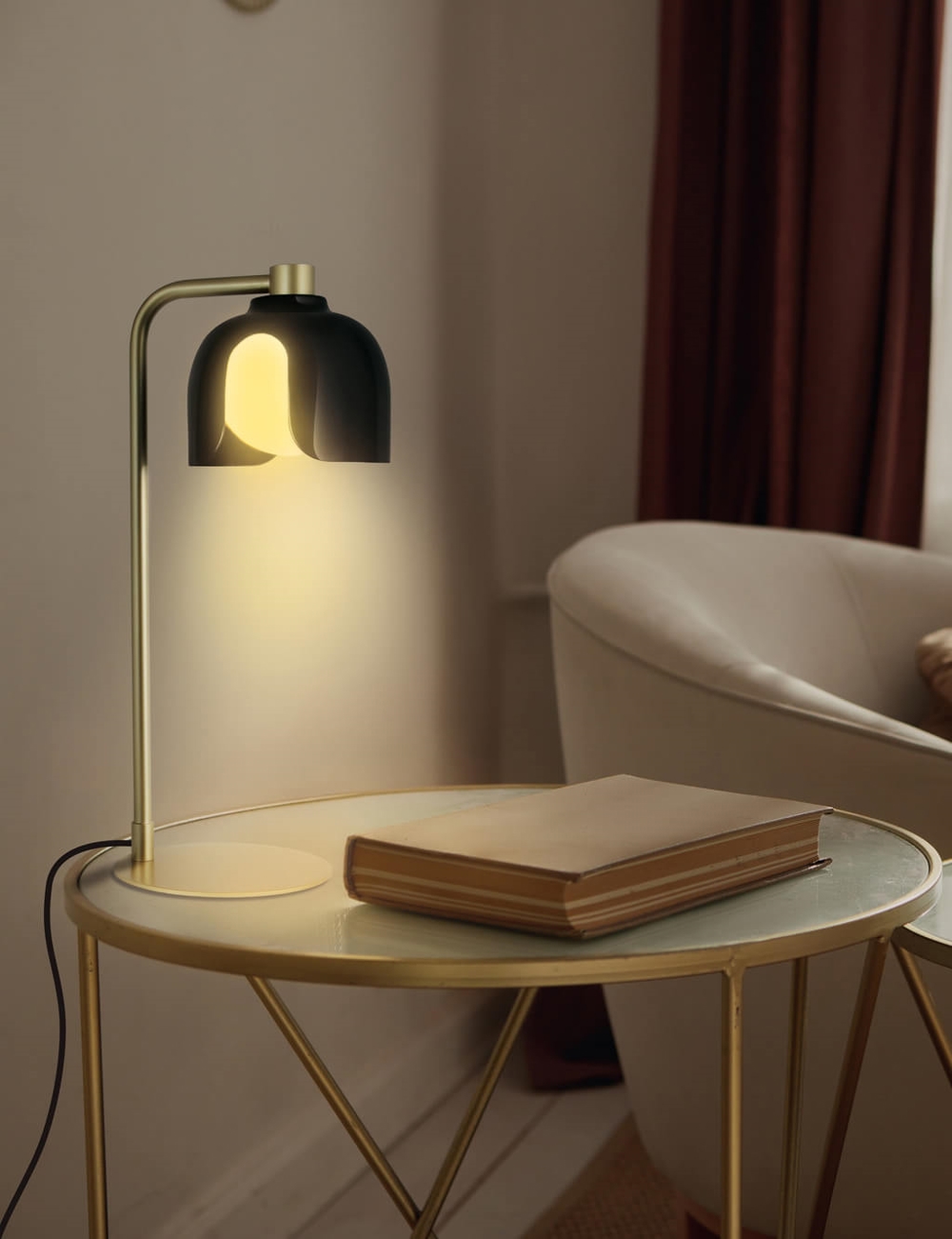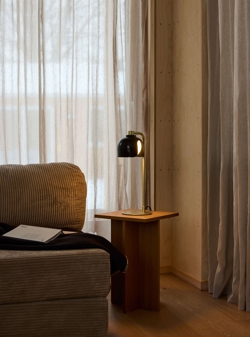 Die Tischlampe ist in mehreren Farben mit passendem Stoffkabel erhältlich.