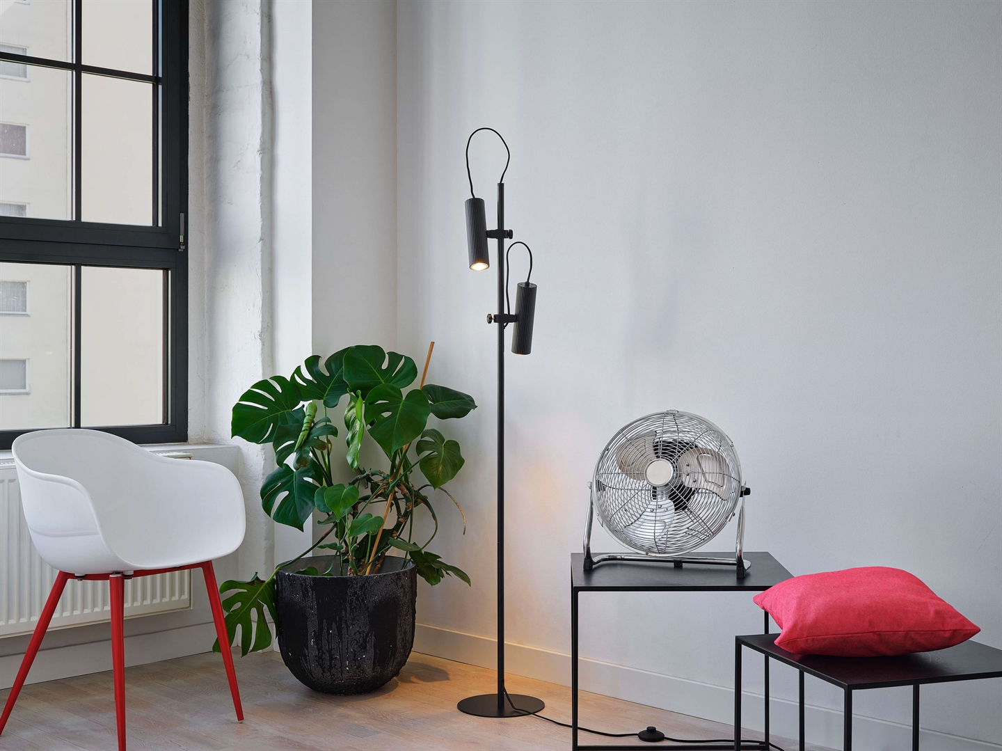 Die Stehlampe Decor Drums aus Stahl mit mattschwarzer Oberfläche hat ein minimalistisches Design, das perfekt in viele Einrichtungsstile passt. Die geriffelten Schirme sind ein dezentes Detail, das der Lampe einen raffinierten Ausdruck verleiht. Die Lichtausrichtung kann mit den zwei Schirmen angepasst werden und macht die Lampe zu einer idealen Wahl als Leselicht neben dem Sessel oder als stimmungsvolle Beleuchtung im Wohnzimmer.