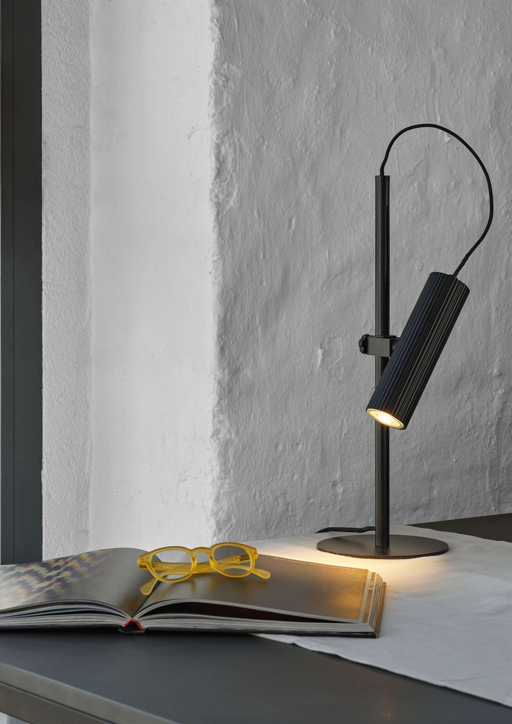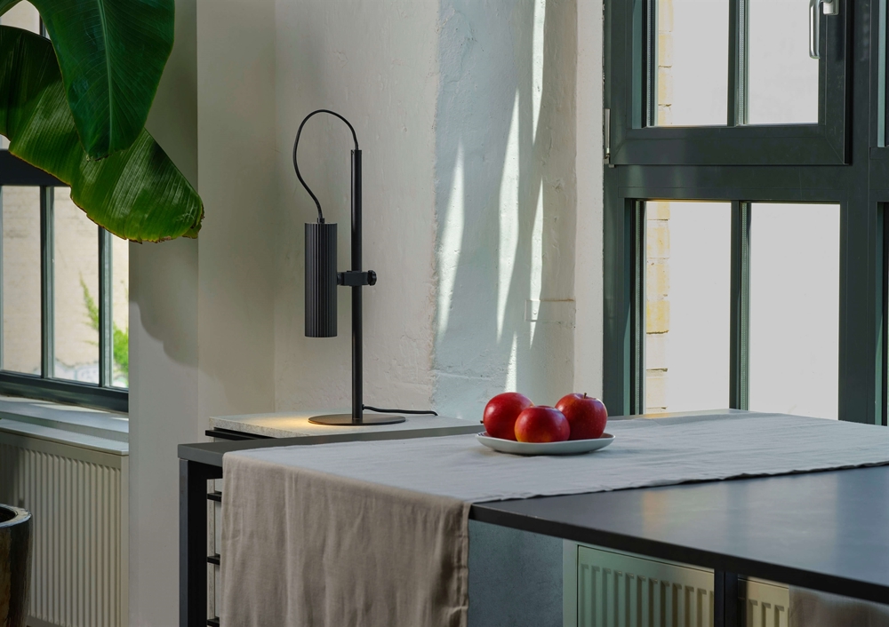 Die Tischlampe Decor Drums aus Stahl mit mattschwarzer Oberfläche hat ein minimalistisches Design, das perfekt in viele Einrichtungsstile passt. Der geriffelte Schirm ist ein dezentes Detail, das der Lampe einen raffinierten Ausdruck verleiht. Die Lampe kann die Lichtausrichtung anpassen und ist eine ideale Wahl für den Schreibtisch, Nachttisch oder das Regal.