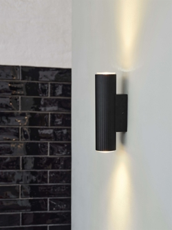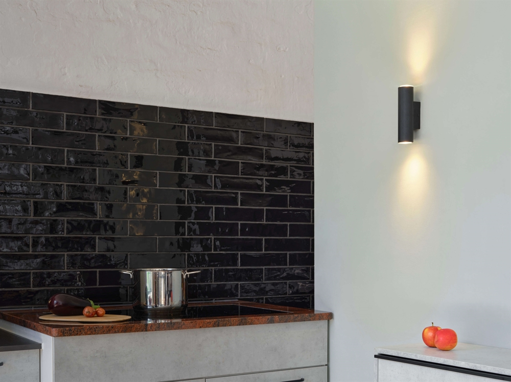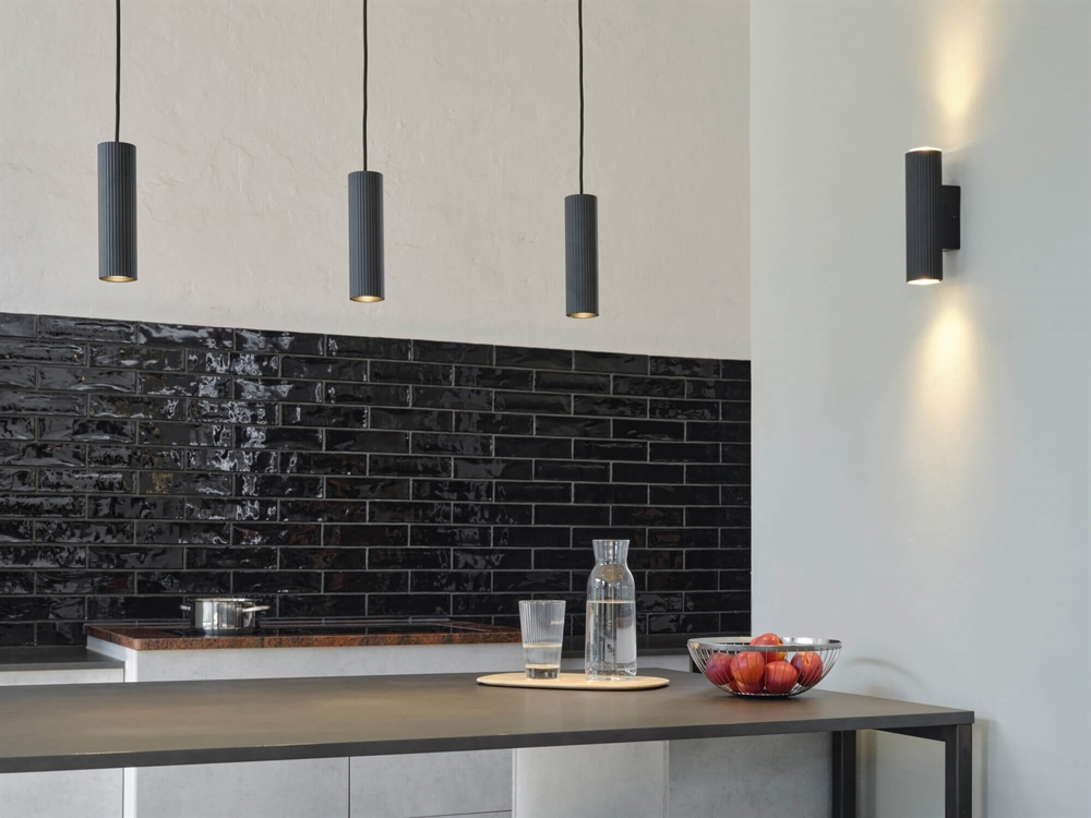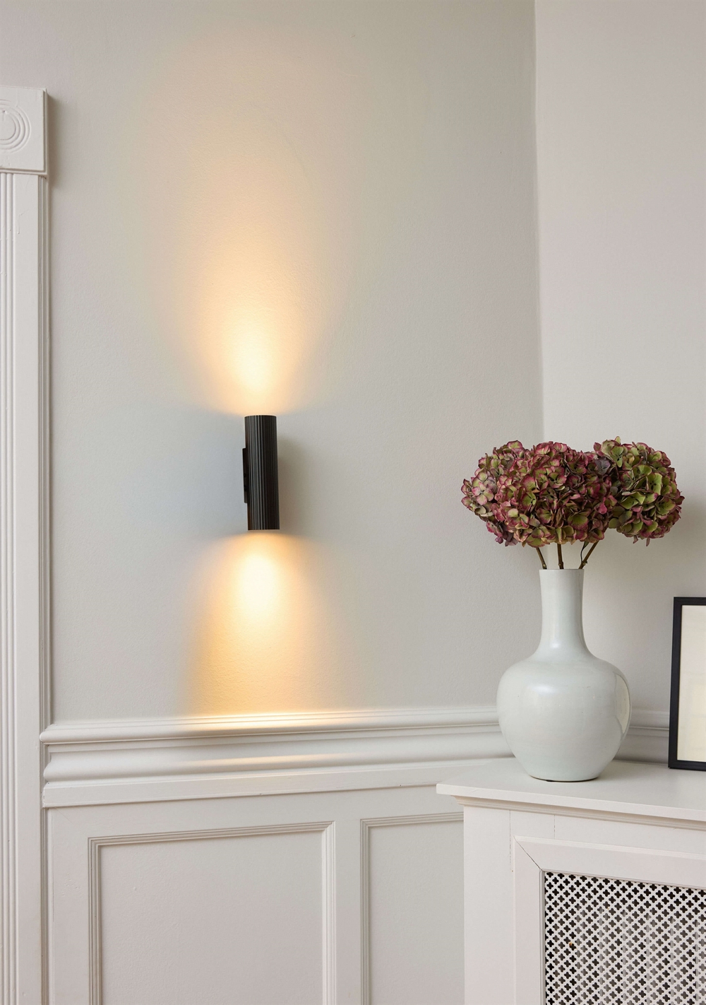 Die Wandleuchte Decor Drums aus Stahl mit mattschwarzer Oberfläche hat ein minimalistisches Design, das perfekt in viele Einrichtungsstile passt. Die geriffelten Schirme sind ein dezentes Detail, das der Lampe einen raffinierten Ausdruck verleiht.