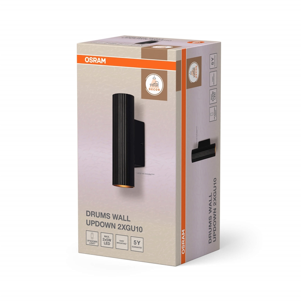 Die Wandleuchte strahlt das Licht sowohl nach oben als auch nach unten und kann vorteilhaft mit anderen Lampen der Decor Drums-Serie kombiniert werden, um ein harmonisches Gesamtbild zu schaffen. Sie muss fest verdrahtet direkt an den Lampenauslass montiert werden.