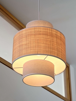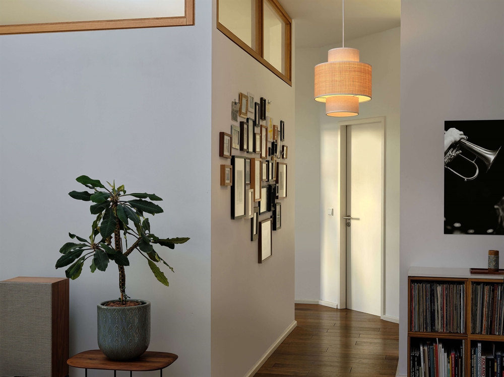 Die Pendelleuchte Decor Wrap Cone ist eine ideale Wahl für die Beleuchtung im Eingangsbereich, Flur, Treppe und Keller oder im Wohnzimmer und Schlafzimmer. Der Lampenschirm aus Textil und Naturmaterialien erzeugt einen warmen Lichteffekt im Raum.