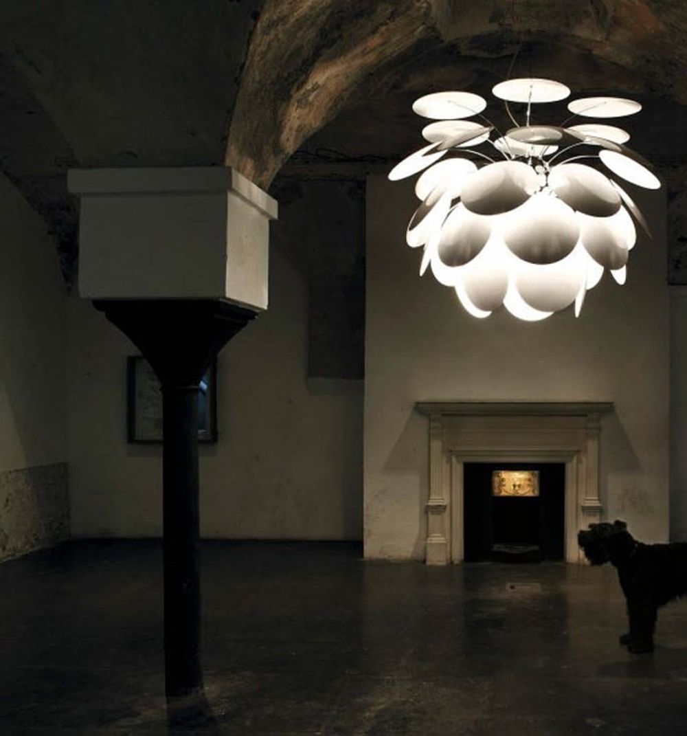Der Schirm der Pendelleuchte besteht aus 35 Kreisscheiben aus ABS-Kunststoff, die einen leichten und feinen Ausdruck verleihen.