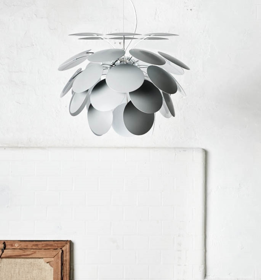 Die Leuchte besteht aus 35 Kreisscheiben aus ABS-Kunststoff, die ihr einen leichten und feinen Ausdruck verleihen.