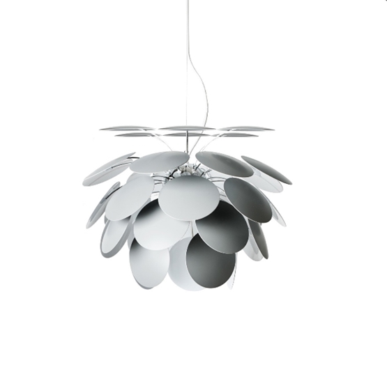 Die Discoco Pendelleuchte besteht aus 35 kreisförmigen ABS-Plastikscheiben, die durch ihre Anordnung der Leuchte einen leichten und eleganten Ausdruck verleihen.