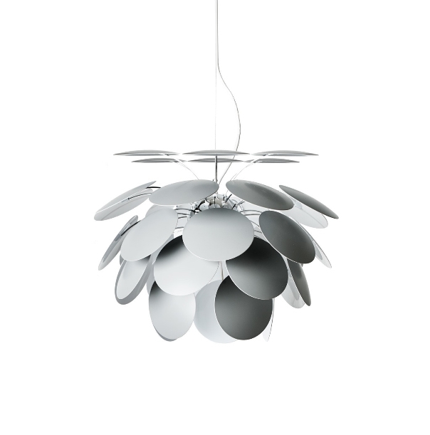 Der Schirm der Pendelleuchte besteht aus 35 Kreisscheiben aus ABS-Kunststoff, die der Leuchte ihren leichten und dekorativen Ausdruck verleihen.