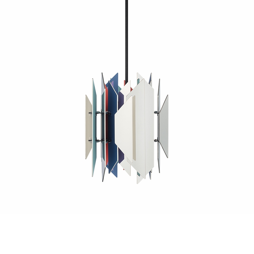 Das Besondere an der Pendelleuchte ist ihre Fähigkeit, ein schönes, farbenfrohes Zusammenspiel von Licht zu erzeugen, das entsteht, wenn das Licht auf die trapezförmigen Elemente trifft, die in verschiedenen Farben lackiert sind.
