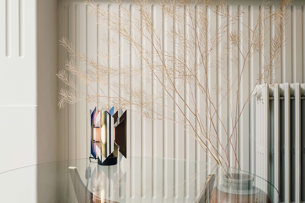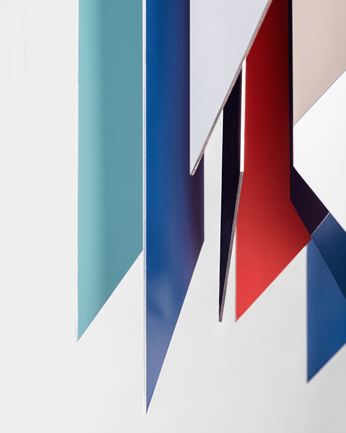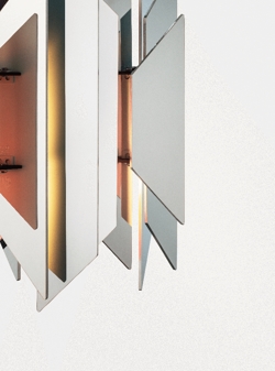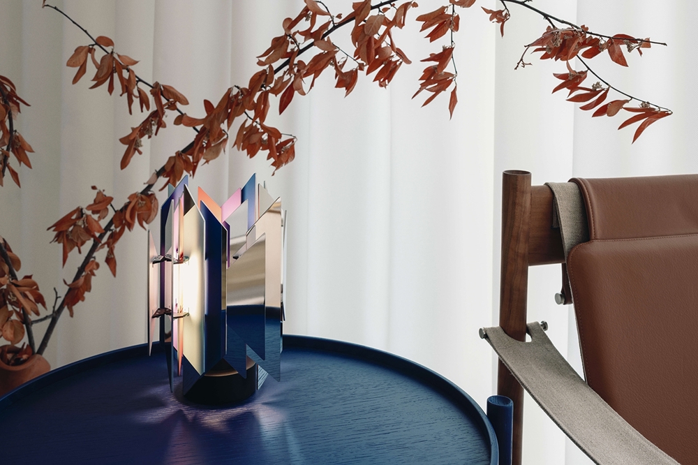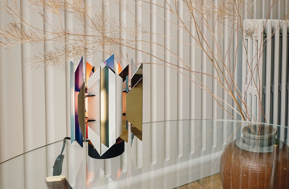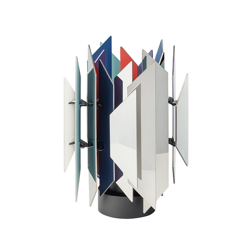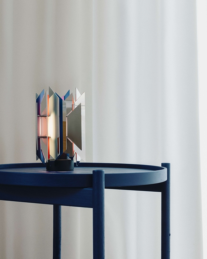 Das Besondere an der Tischlampe ist ihre Fähigkeit, ein schönes, farbenfrohes Zusammenspiel von Licht zu erzeugen, das entsteht, wenn das Licht auf die in verschiedenen Farben lackierten Trapezoide trifft.