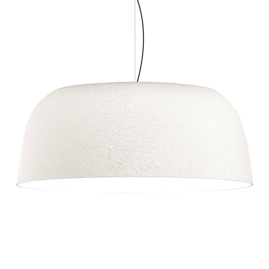 Die Außenseite der Lampe hat eine Oberfläche, die aussieht, als wäre sie aus Stein, und vermittelt so den Eindruck von schwerem Gewicht. Dies steht im Kontrast zur Innenseite der Lampe, die eine glatte, weiße Oberfläche hat, die das Licht auf schönste Weise in den Raum reflektiert.