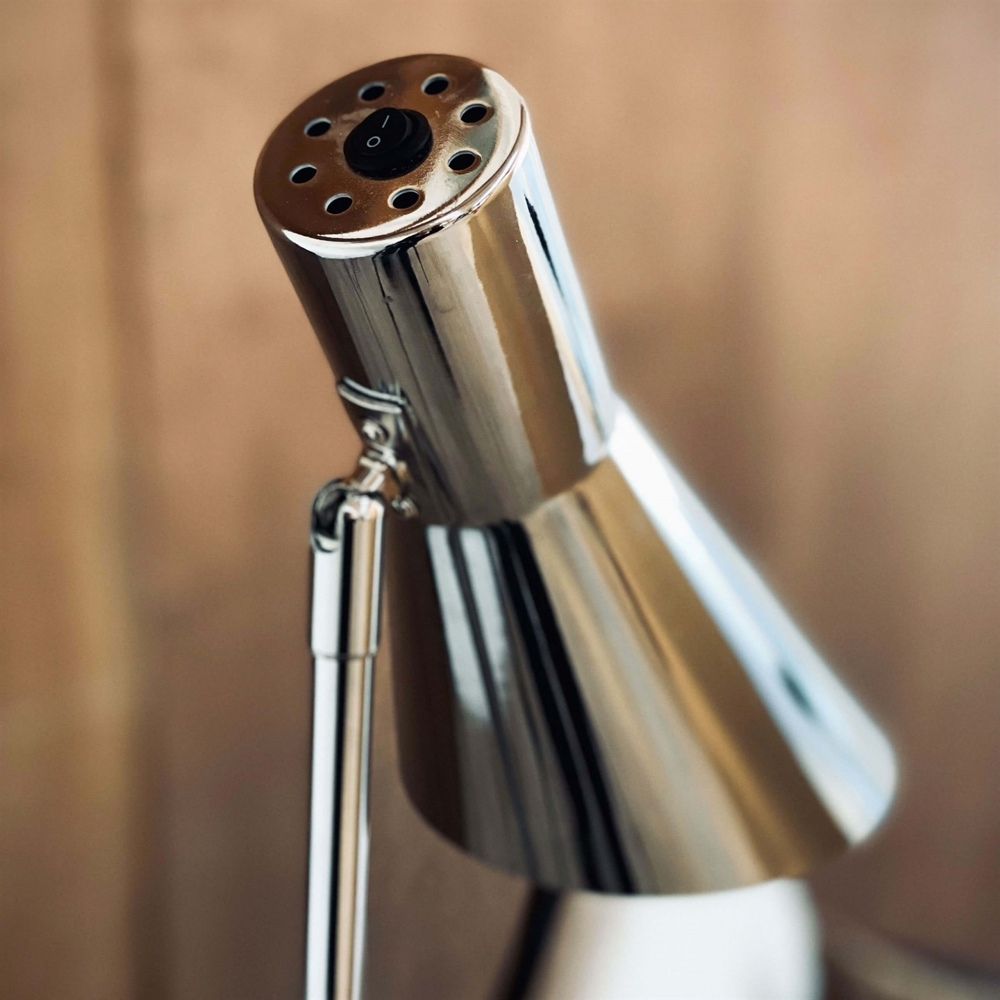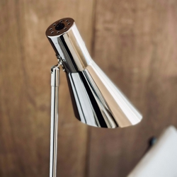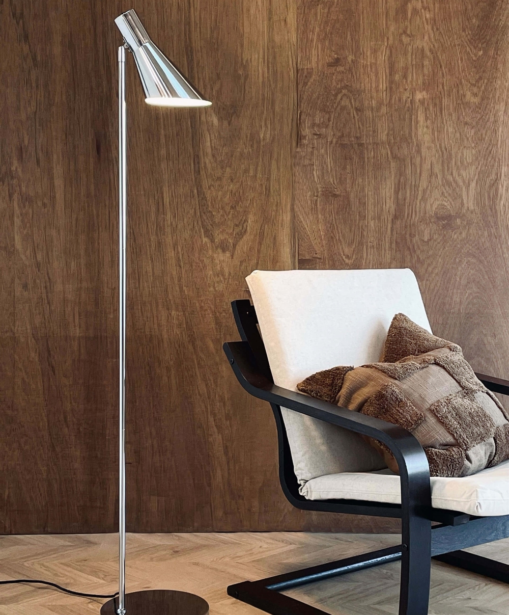 DL 12 Stehlampe hat ein minimalistisches Design und wird mit dem stilvollen und funktionalen Design in Chrom eine raffinierte und exklusive Ergänzung für jeden Raum sein. Der Schalter ist praktisch am Schirm platziert, der gekippt und in die gewünschte Richtung gedreht werden kann.