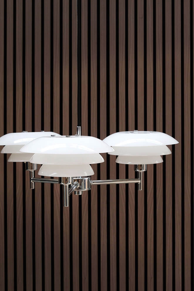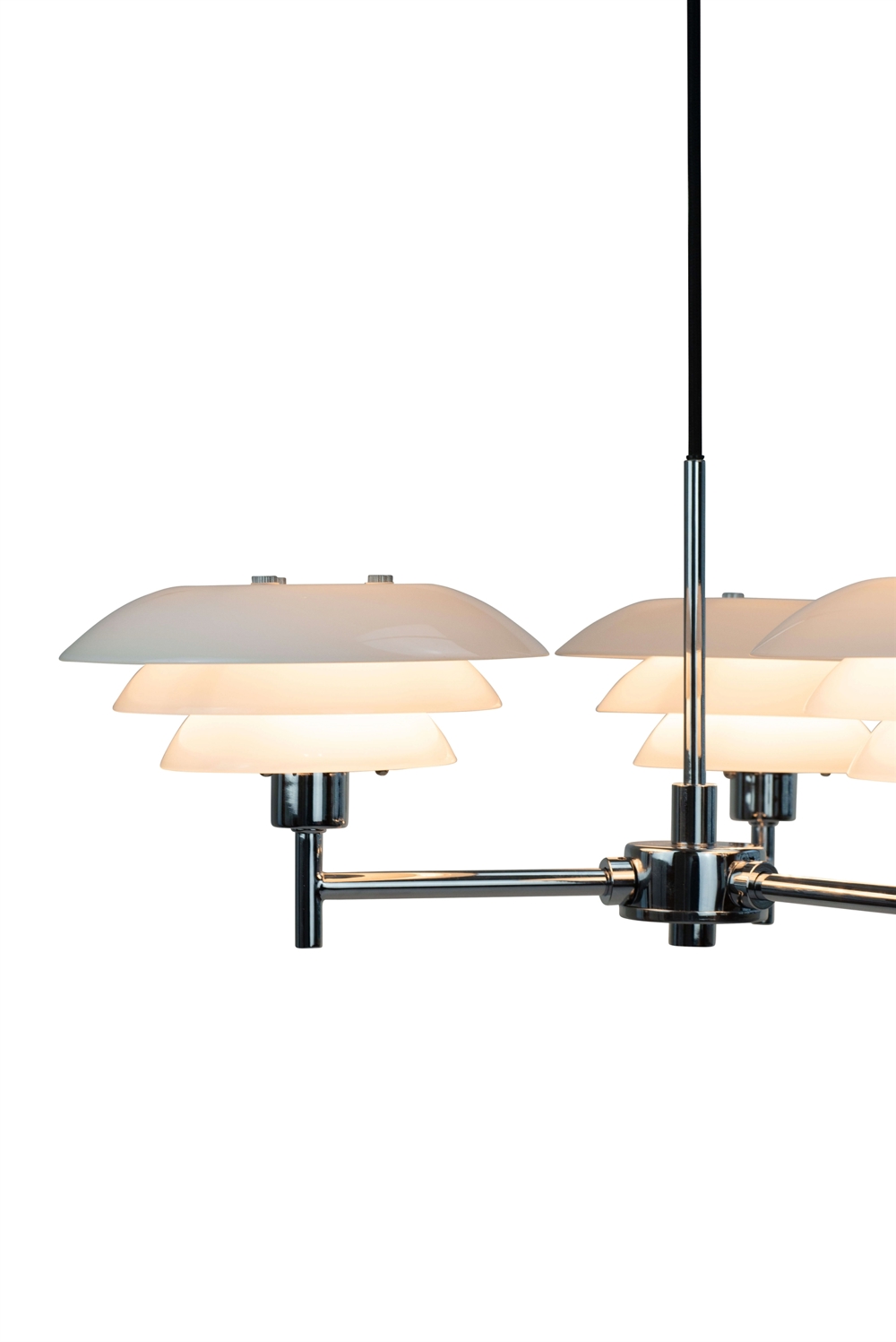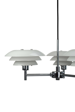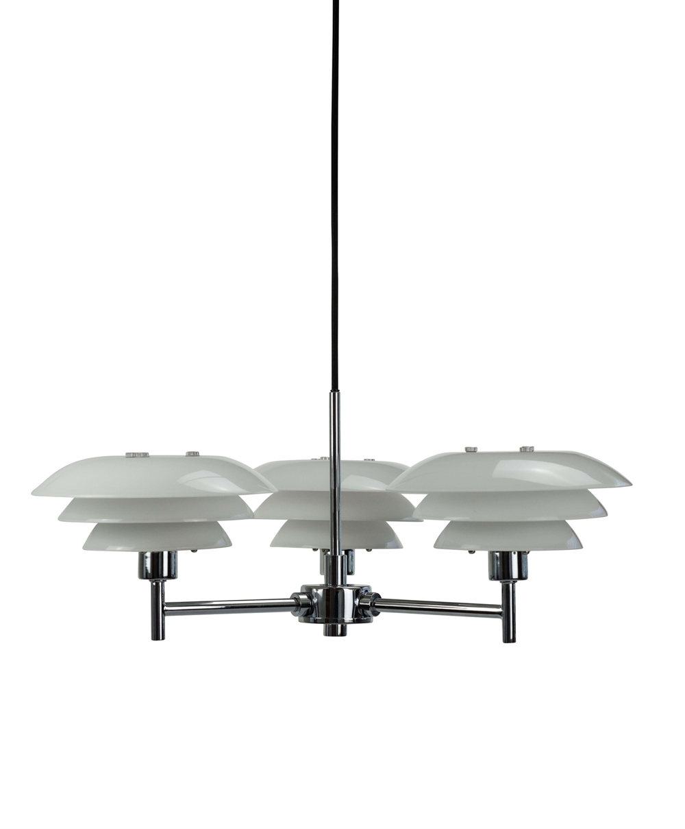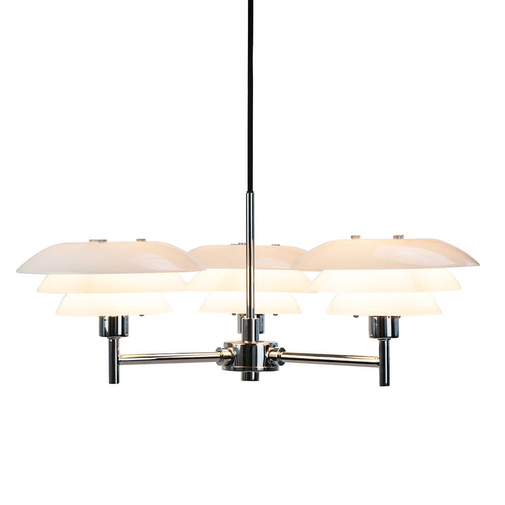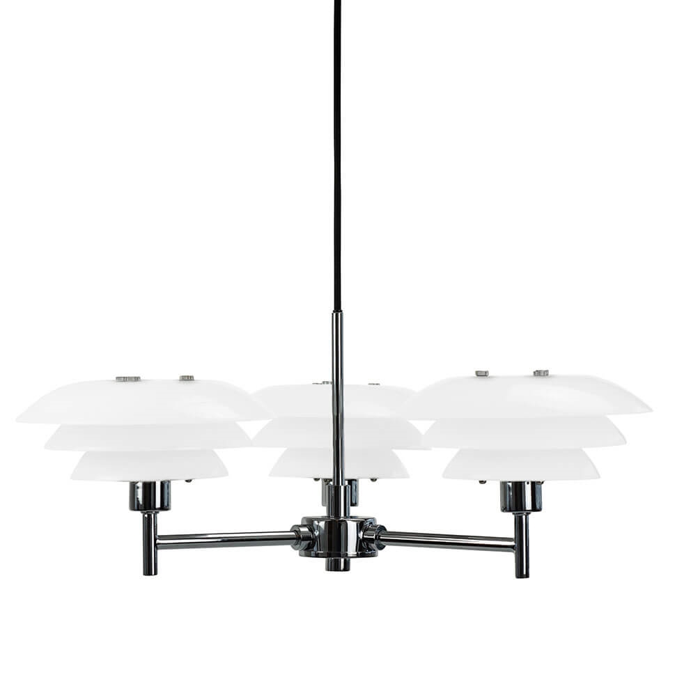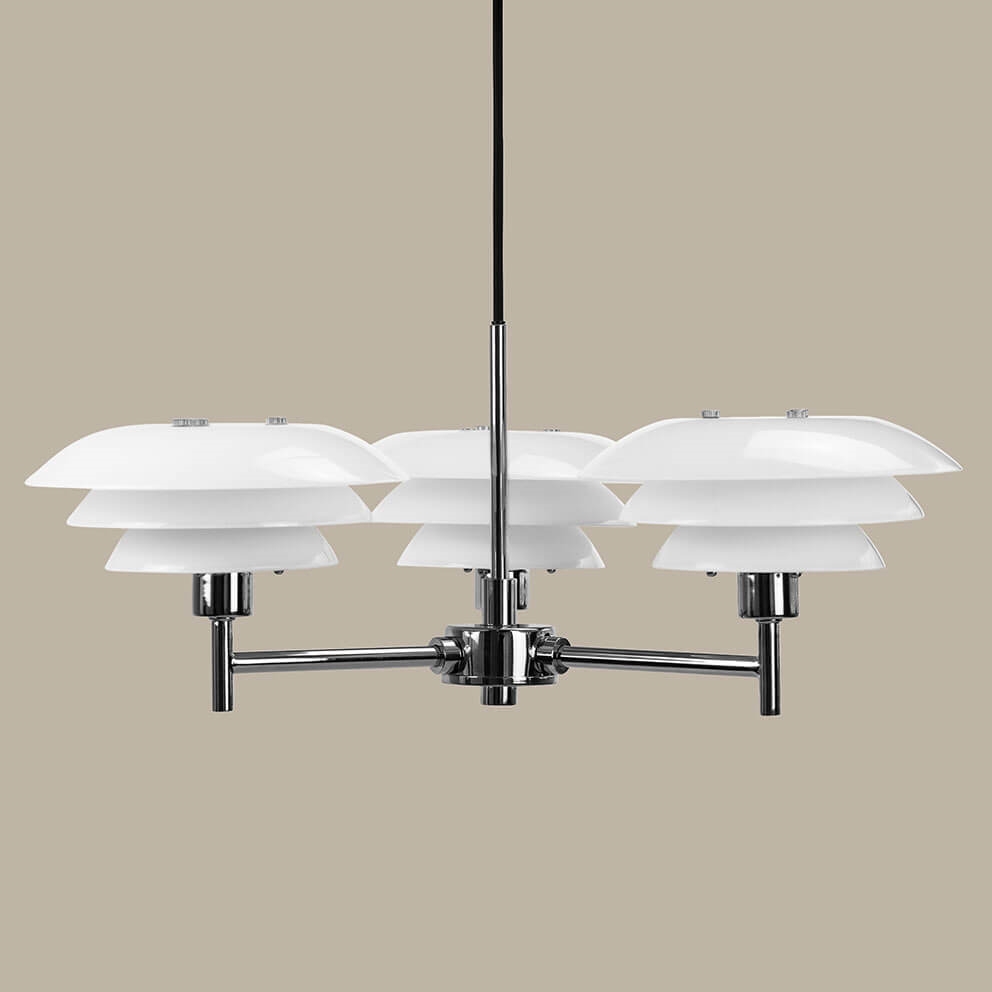 DL20 Kronleuchter in Opal und Chrom bringt zeitlose Schönheit in Ihre Einrichtung und eignet sich perfekt als Lampe über dem Esstisch, im Wohnzimmer oder in einer Diele. Der Kronleuchter hat drei Arme, die jeweils eine Lichtquelle mit drei Schirmen aus Opalglas haben. Zusammen mit dem Design in Chrom verleiht das Opalglas dem Kronleuchter einen eleganten Ausdruck, der ein klassisches Element in Ihr Zuhause bringt.
