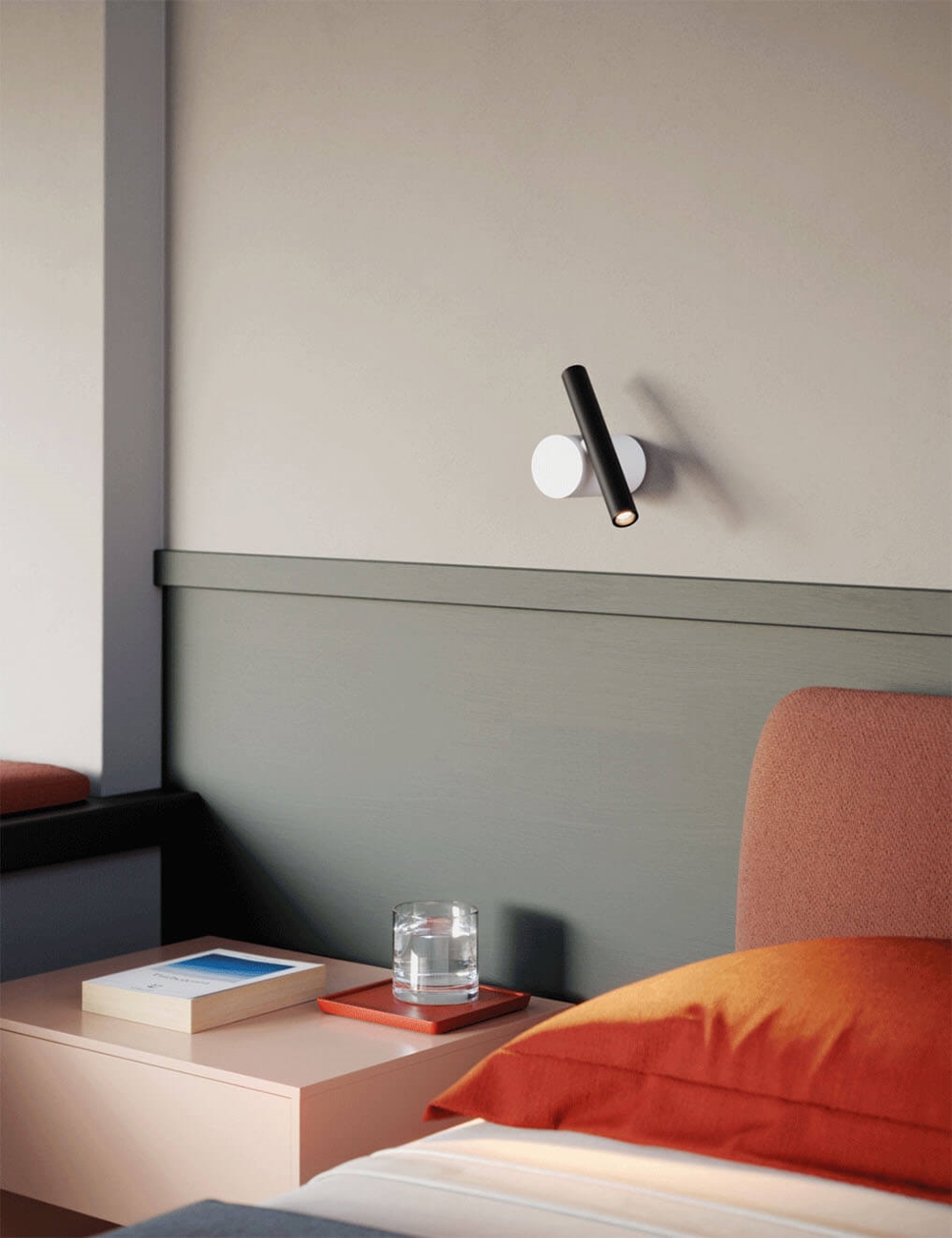 Die Wand- und Deckenleuchte Doi besteht aus einer eleganten Basis und einem LED-Spot in Form eines Schirmzylinders von 18 cm. Die Basis und der Schirmzylinder sind durch ein mechanisches Gelenk verbunden, sodass das Licht sowohl nach oben als auch nach unten gedreht und ausgerichtet werden kann.