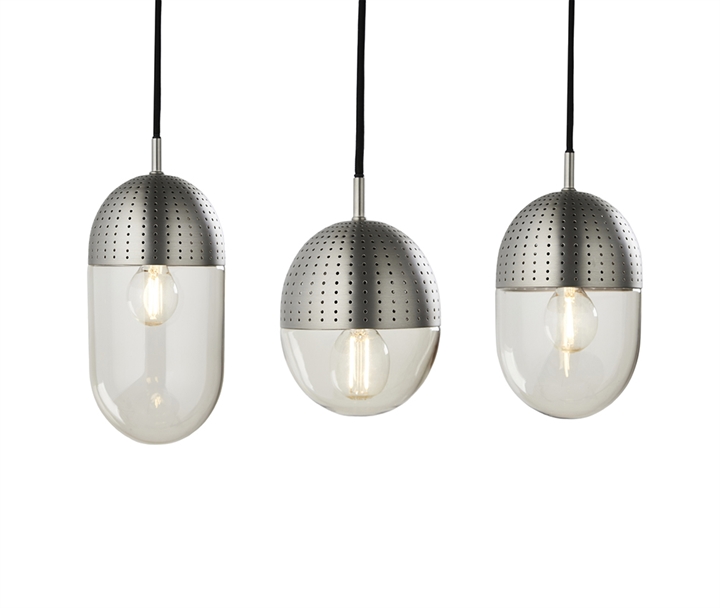 Die Dot Pendelleuchte besteht aus einem Glasschirm, dessen oberer Teil mit einem perforierten Überzug versehen ist. Die kleinen Löcher im oberen Teil des Schirms erzeugen einen sanften und ruhigen Effekt, da nur ein Teil des Lichts hindurchscheinen kann. Die Pendelleuchte ist so gestaltet, dass sie eine gemütliche Atmosphäre schafft und eignet sich daher ideal, um in einer Ecke des Wohnzimmers aufgehängt zu werden.