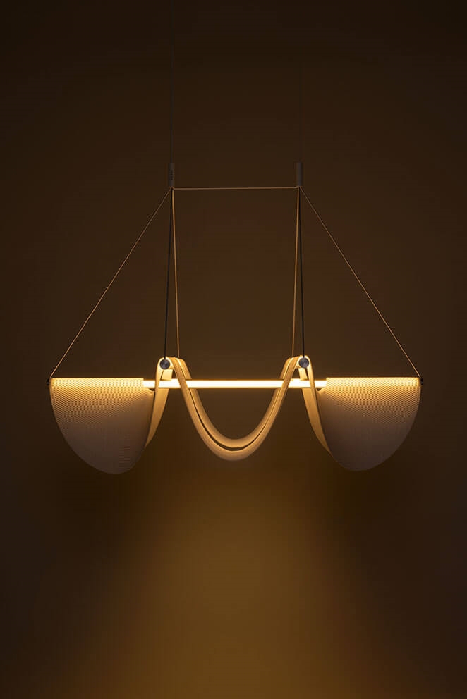 Drape Light 118 stellt die klassischen Vorstellungen von Beleuchtung in Frage. Die Struktur der Lampe mit drei LED-Leuchtmitteln bietet einen stabilen Rahmen, während der drapierte organische Polyesterschirm durch die Schwerkraft einen beeindruckenden visuellen Effekt im Zusammenspiel von Licht und Schatten erzeugt.