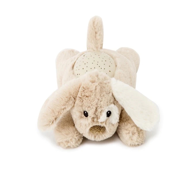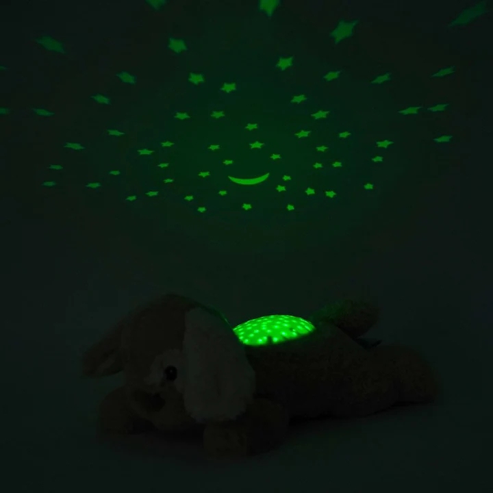 Durch Drücken auf den Rücken des Hundes leuchten die Sterne auf, die 45 Minuten lang anbleiben und dann automatisch ausgehen. Die Kinder können so langsam in einen ruhigen Schlaf gleiten.