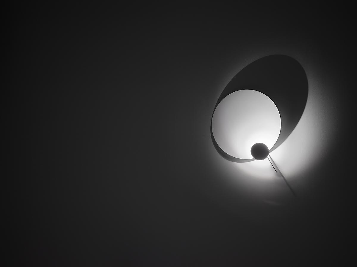 Eclipse Ellipse Wandleuchte hergestellt aus Stahl und Aluminium. Eclipse Ellipse ist ein Spiel aus Licht und Schatten. Das Lichtobjekt ist als Wandleuchte konzipiert. Wenn Sie die Lampe einschalten, erscheint eine Komposition aus Ellipse und Kreisen an der Wand. Der Benutzer der Lampe ist Mitgestalter. Sowohl die Neigung der großen Scheibe als auch die Position der kleinen Scheibe können angepasst werden.