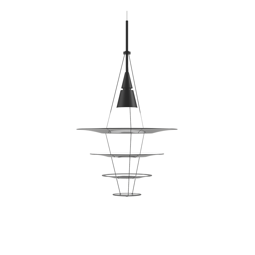 Der Designer hat den klassischen Kronleuchter neu interpretiert und verwendet dünne konzentrische Kreise. Enigma bedeutet Rätsel, und die Lampe trägt diesen Namen, weil sie aus der Ferne betrachtet zu schweben scheint.