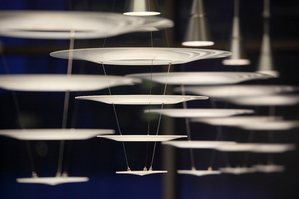 Der Designer hat den klassischen Kronleuchter neu gestaltet und dünne konzentrische Kreise verwendet. Enigma bedeutet Rätsel, und die Lampe trägt diesen Namen, weil sie aus der Ferne betrachtet zu schweben scheint.