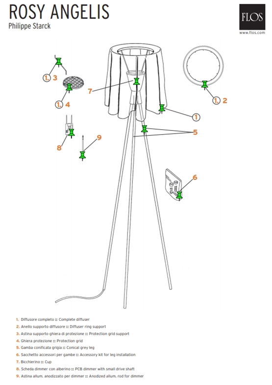 Rosy Angelis Stehleuchte entworfen von Philippe Starck. Dies ist ein Ersatzteil bestehend aus einem Dimmer für die Rosy Angelis Stehleuchte von Flos. Es ist Nr. 8 auf der Zeichnung.