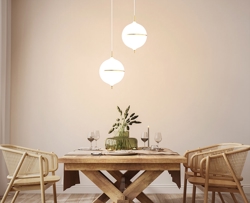 Die Pendelleuchte ist in zwei Größen mit weißem oder schwarzem Kabel erhältlich. Es gibt auch Wandleuchten in der Lampenserie.