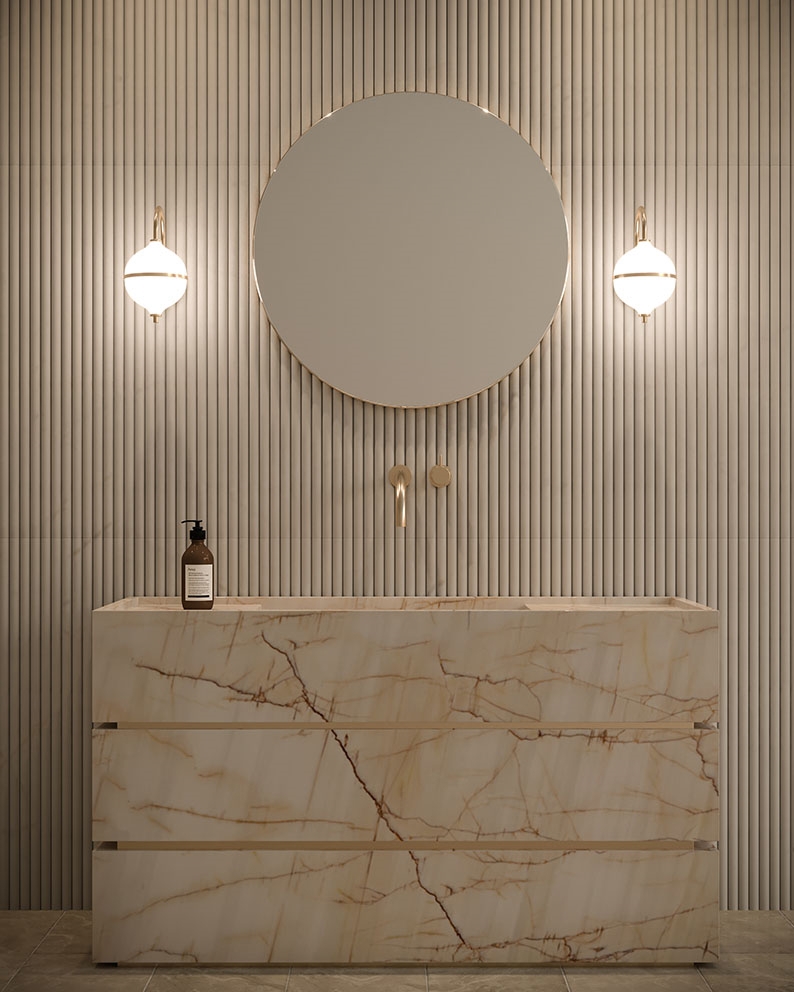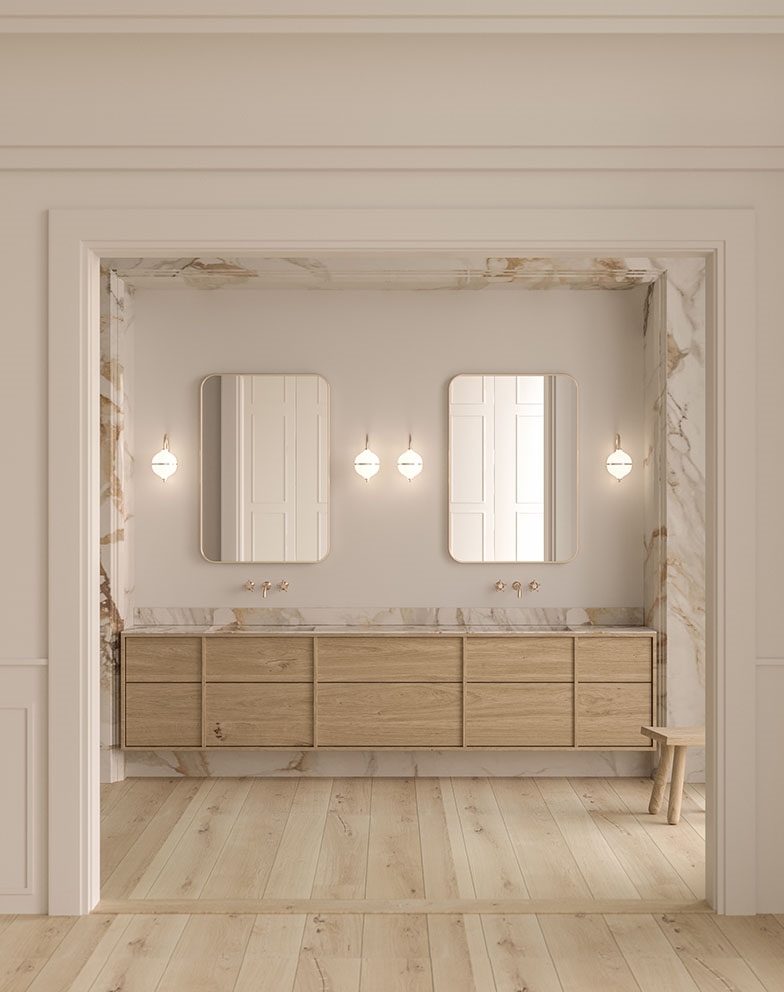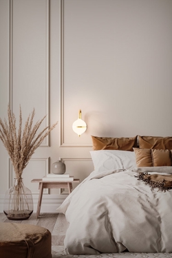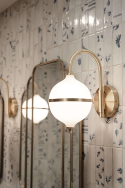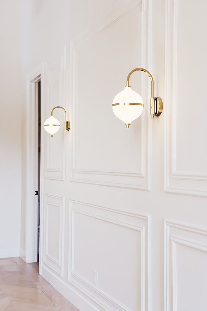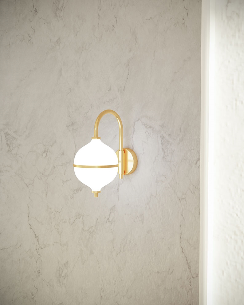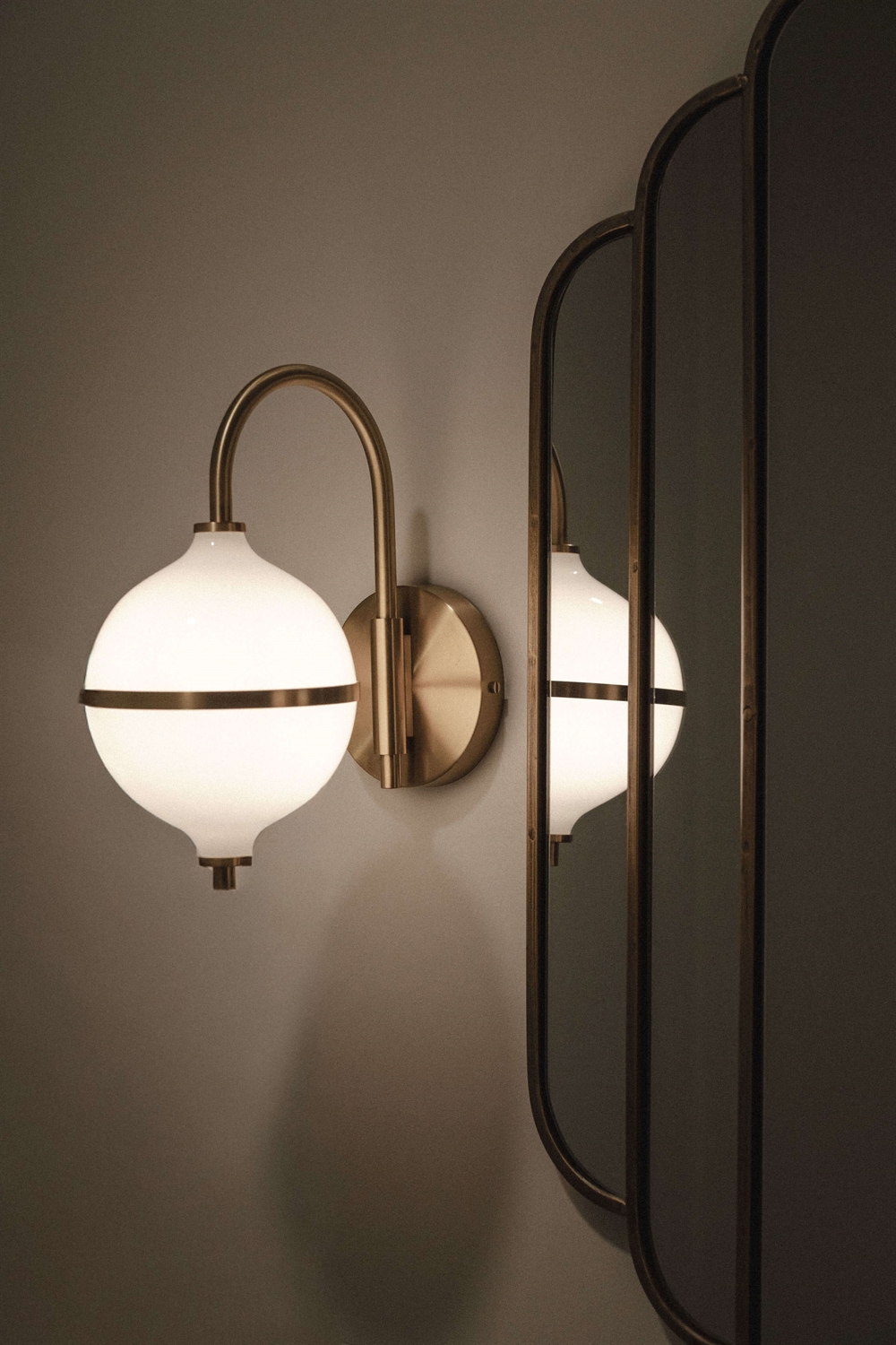Das Design ist handgefertigt aus Messing und Opalglas und ist eine zeitlose Kombination aus skandinavischem Minimalismus und moderner Eleganz, wobei das weiße Kabel den hellen und harmonischen Ausdruck der Leuchte unterstreicht. Eine naheliegende Wahl als Nachttischlampe oder Beleuchtung für das Wohnzimmer oder den Eingangsbereich. Dank der IP44-Klassifizierung der Leuchte kann sie auch am Spiegel im Badezimmer montiert werden.