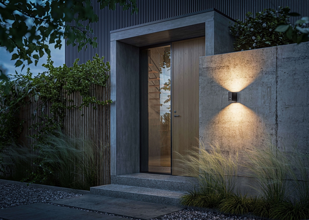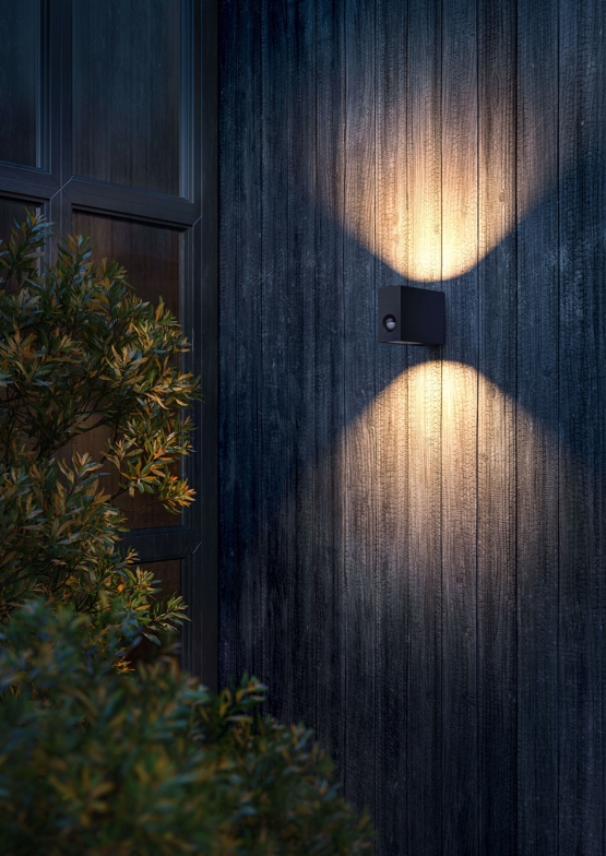 Eye Control aus pulverbeschichtetem Druckguss-Aluminium ist eine stilvolle Außenleuchte mit Bewegungssensor und einem guten Licht, das sowohl nach oben als auch nach unten gerichtet ist. Die funktionale Außenwandleuchte in Schwarz ist eine der Varianten von IP44.de mit Küstenqualität-Finish, das sie besonders korrosionsbeständig macht. Die Haltbarkeit wurde in einem Labor mit einem Salzsprühnebeltest geprüft.