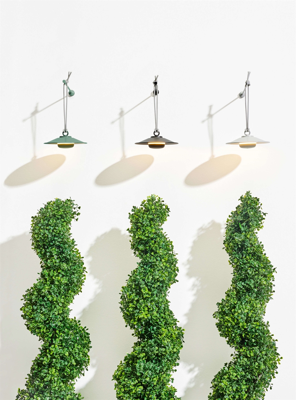 Die Chap-O Pendelleuchte ist in den Farben Anthrazit, Desert und Sage erhältlich. Das LED-Element, der Schirm und die mitgelieferte Wandhalterung haben alle die gleiche Farbe, während die Aufhängeschlaufe bei allen drei Varianten grau ist.