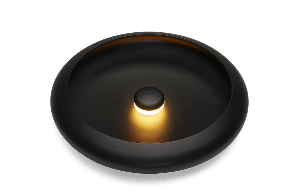 Die Akkuleuchte besteht aus einem Schirm aus beschichtetem Metall und einer magnetischen Lampe aus Silikon. Das Licht kann stufenweise gedimmt werden, indem man sanft auf den Ring in der Mitte drückt. Bei voller Leistung leuchtet sie bis zu 8 Stunden und bei niedrigster Leistung bis zu 90 Stunden. Die Lampe gibt ein warmes Licht ab, aber die Farbe der Lampe beeinflusst die Stimmung des ausgestrahlten Lichts.