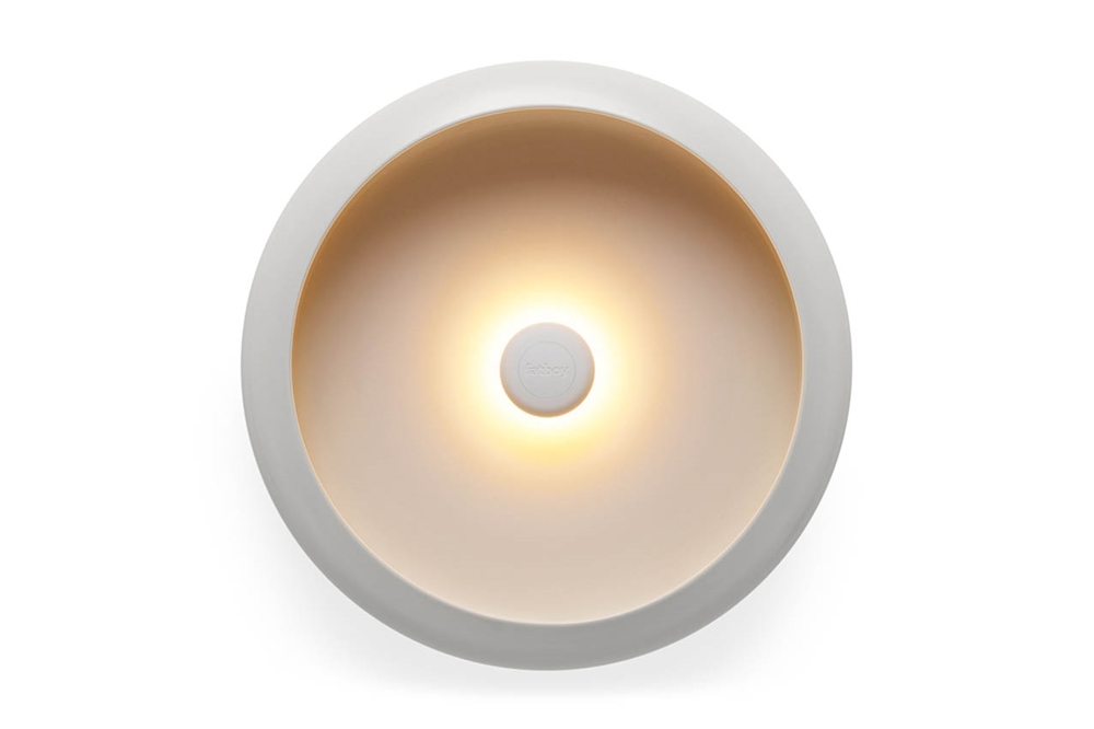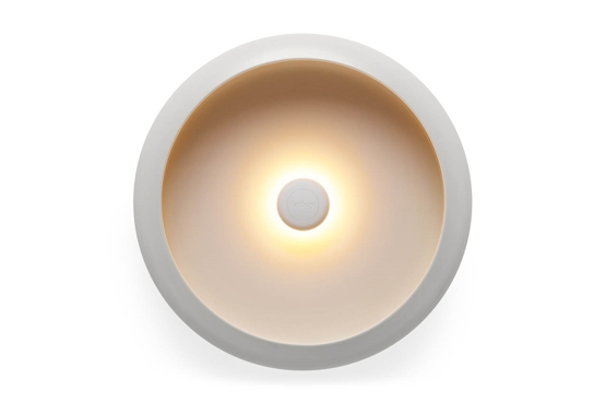 Die Akkulampe besteht aus einem Schirm aus beschichtetem Metall und die Lampe ist aus Silikon gefertigt. Das Licht kann stufenweise gedimmt werden, indem man sanft auf den Ring in der Mitte drückt. Die Lampe gibt ein warmes Licht ab, aber die Farbe der Lampe beeinflusst die Stimmung des ausgestrahlten Lichts.