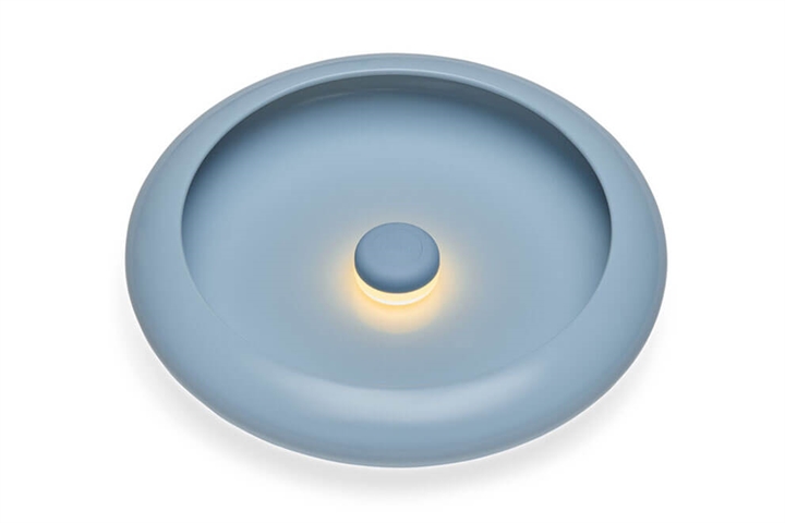 Die Akkulampe besteht aus einem Schirm aus beschichtetem Metall und die Lampe ist aus Silikon gefertigt. Das Licht kann stufenweise gedimmt werden, wenn man sanft auf den Ring in der Mitte drückt. Die Lampe gibt ein warmes Licht ab, aber die Farbe der Lampe beeinflusst die Stimmung des ausgestrahlten Lichts.
