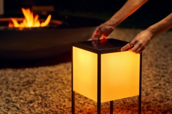 Die Außen-Solarlampe Fil hat ein vom Bauhaus inspiriertes Design aus Aluminium, das mit weißem wetter- und UV-beständigem Stoff bezogen ist, der zusammen mit einem inneren Würfel aus transluzentem Polycarbonat für ein gleichmäßiges und angenehmes Licht sorgt.