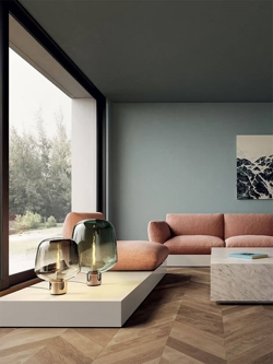 Flar ist in zwei Größen erhältlich: Medium und Large mit einer Höhe von jeweils 47 cm und 62,5 cm. Die Basis hat eine Oberfläche in den Farben Terra oder Pearl, während der Glasschirm honigfarben oder türkis ist.