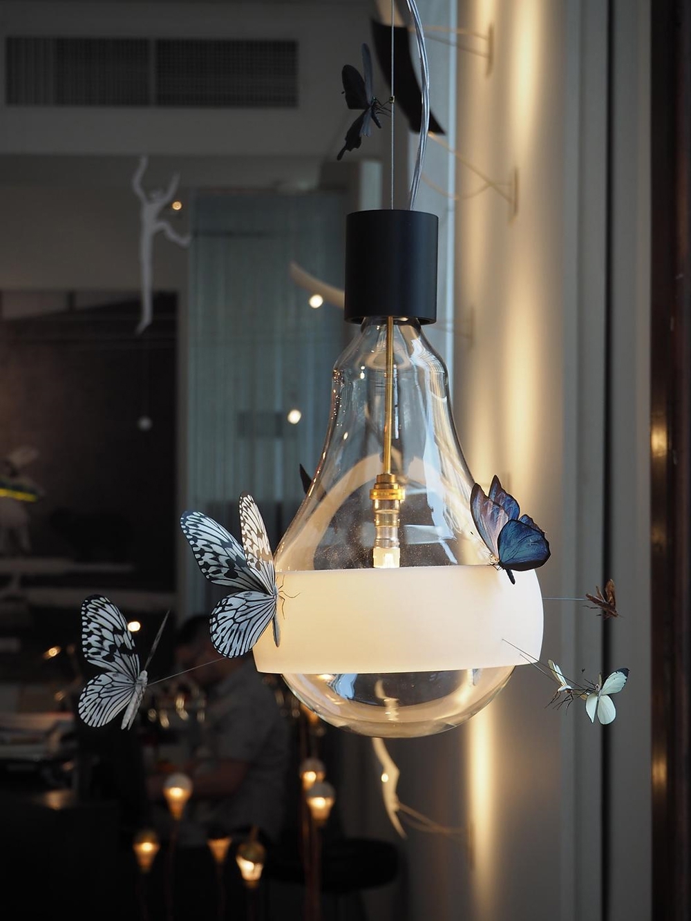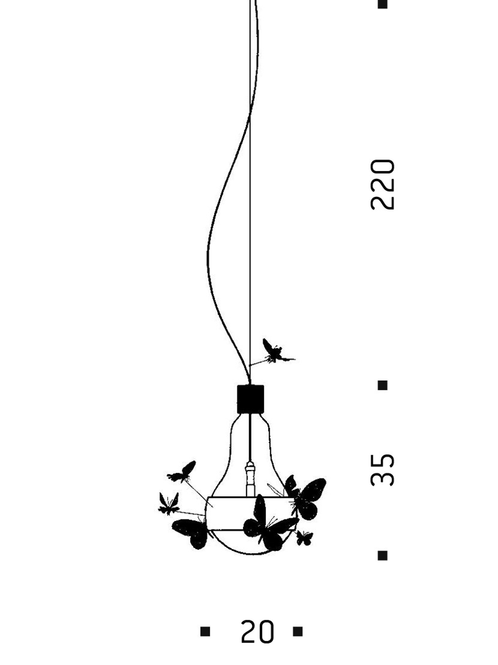 Zehn handgefertigte Schmetterlinge schwirren um die Glühbirne. Flatterby ist eine Limited Edition (200 Stück). Der Ring ist ein 3D-gedrucktes Teil, die Seriennummer ist im Schirm eingeprägt. Als Ingo Maurer Insekten für Flatterby auswählte, entschied er sich für mehrere schwarze und weiße Schmetterlinge wie Black Swallowtail und Rice Paper Butterfly, aber auch Blue Morpho und eine kleine Brown Moth.