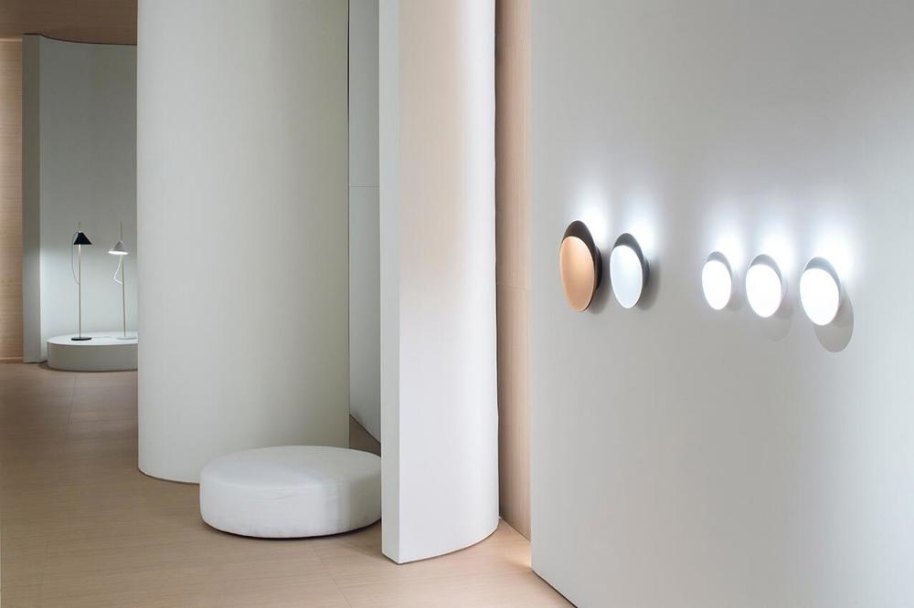 Die Flindt Wandleuchte hat ein funktionales und einfaches Design in einem perfekten Kreis. Das Licht wird auch von einer Öffnung an der Oberseite der Lampe ausgestrahlt, wodurch ein leuchtender Ring aus reflektiertem Licht entsteht, während es gleichzeitig ein asymmetrisches, nach unten gerichtetes Licht abgibt.