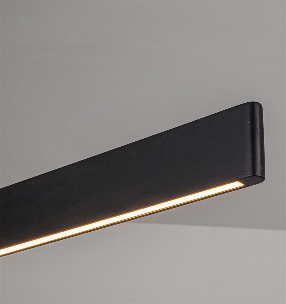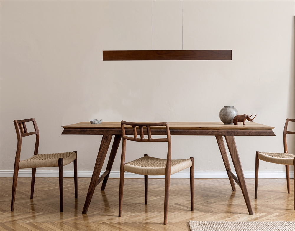 Die Pendelleuchte ist mit zwei verschiedenen Holzfinish erhältlich – Walnuss mit einem warmen, dunklen Schimmer oder schwarze Esche, die einen moderneren Ausdruck verleiht.