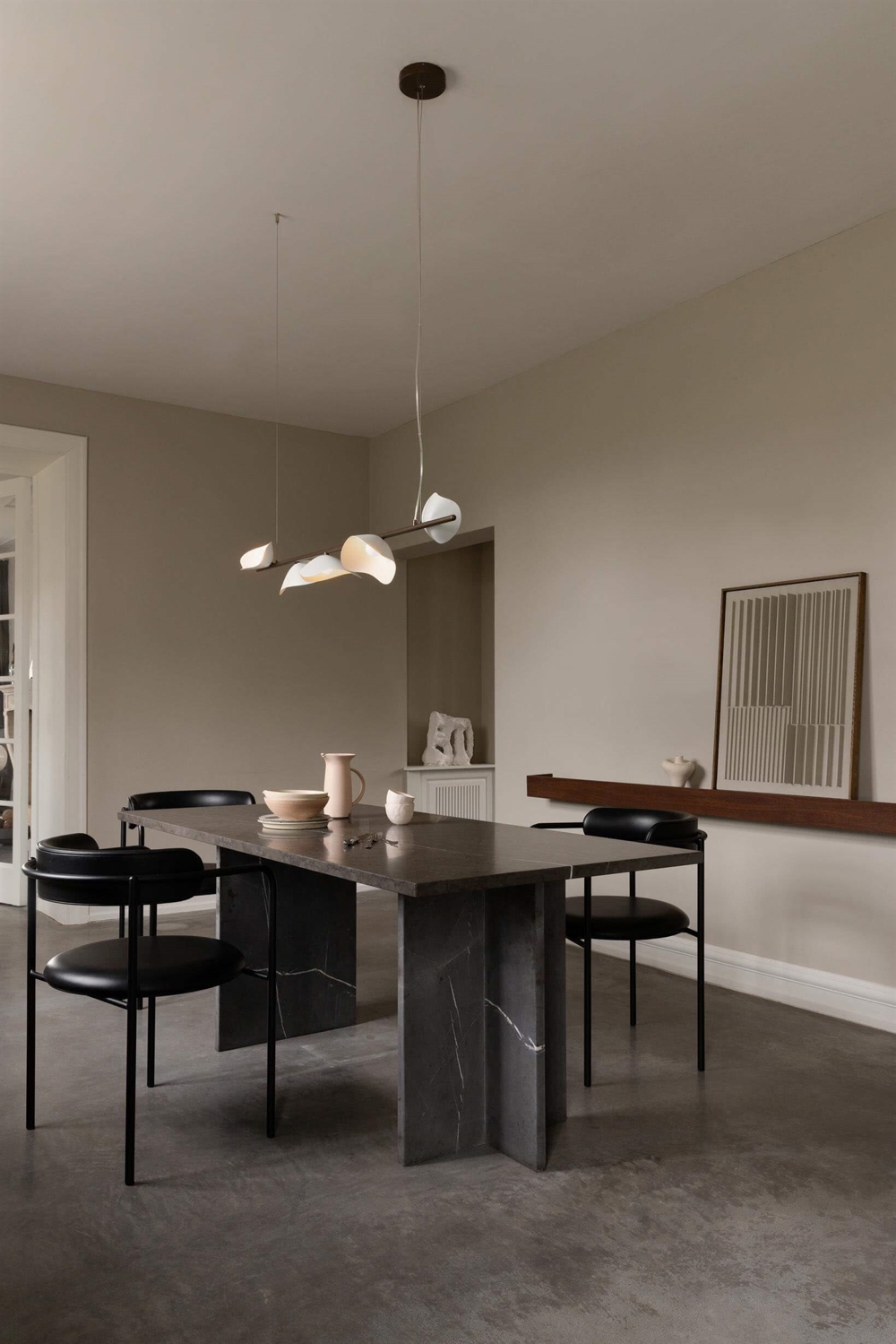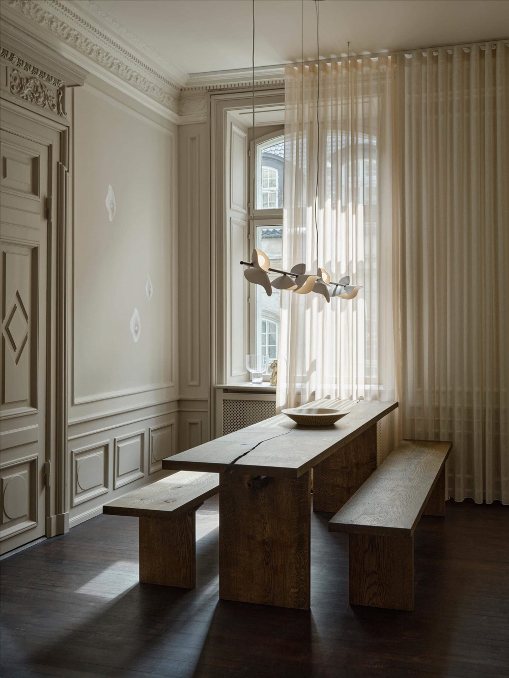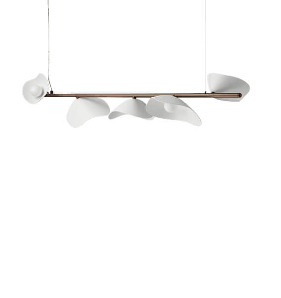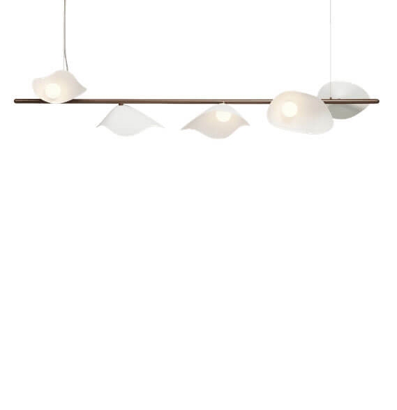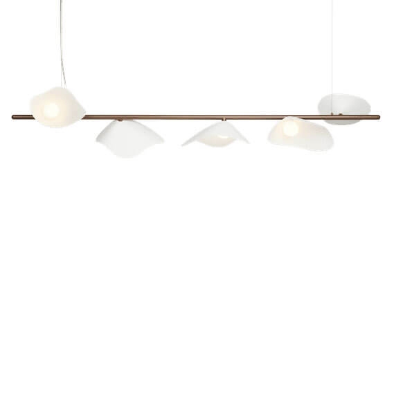 Das Design der Pendelleuchte Florii 5 ist inspiriert von einem Spaziergang durch den Wald an einem hellen Herbsttag, an dem das Sonnenlicht durch die fallenden Blätter tanzte. Das Ergebnis ist eine außergewöhnliche Pendelleuchte mit einem schönen Spiel zwischen Licht und Schatten von den fünf blütenblattförmigen Schirmen, die an der linearen Aufhängung montiert sind. Die elegante, längliche Pendelleuchte mit einer Aufhängung aus metallisch pulverbeschichtetem Dunkelbronze und Schirmen aus Opalglas passt in viele moderne Einrichtungen, beispielsweise allein oder zwei in Verlängerung über dem Esstisch.