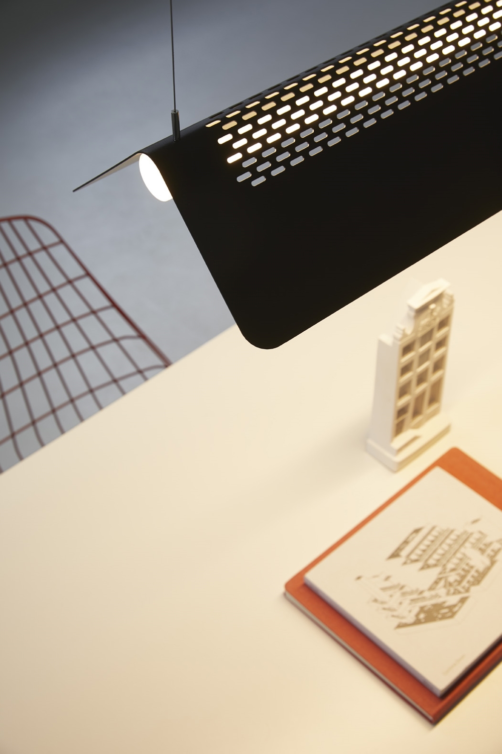 Die Flybye Pendelleuchte besteht aus einem pulverbeschichteten Stahlschirm mit schlanker Silhouette. Der Schirm der Pendelleuchte ruht auf dem speziell angefertigten LED-Rohr, das ein weißes Licht abgibt. Diese beiden Elemente vereinen sich, um Funktionalität und ein direktes, nach unten gerichtetes Licht von außergewöhnlicher Qualität zu bieten. Das Muster des Schirms sorgt jedoch für eine ausgewogene Lichtverteilung im Raum.