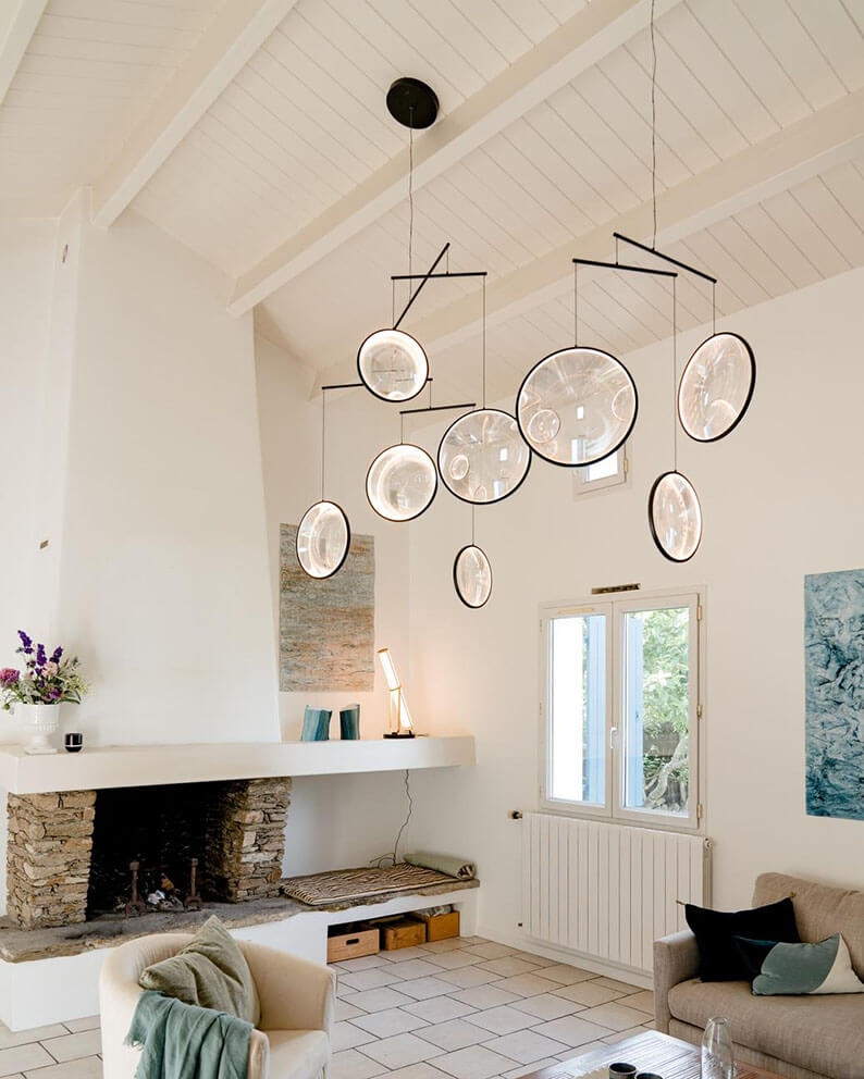 Die Pendelleuchte ist in Schwarz oder Weiß mit 3 oder 4 leuchtenden Scheiben und in Schwarz, Weiß oder Gold mit 5 leuchtenden Scheiben erhältlich.