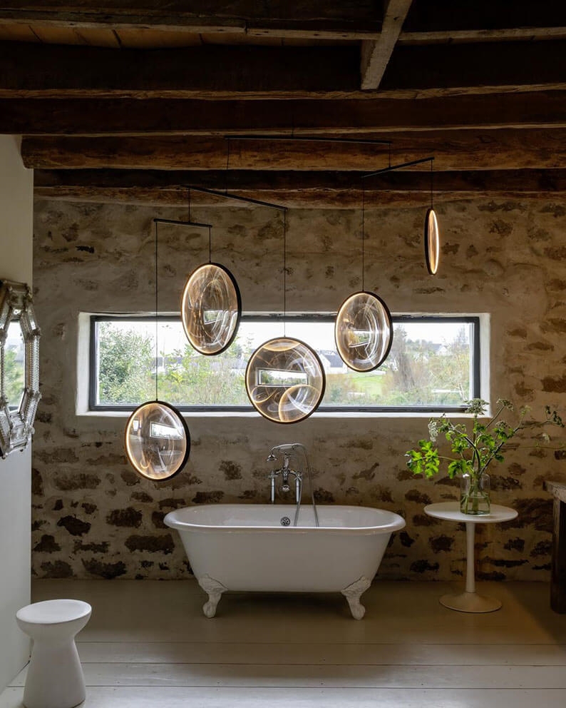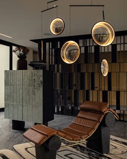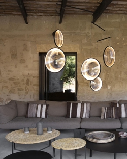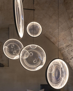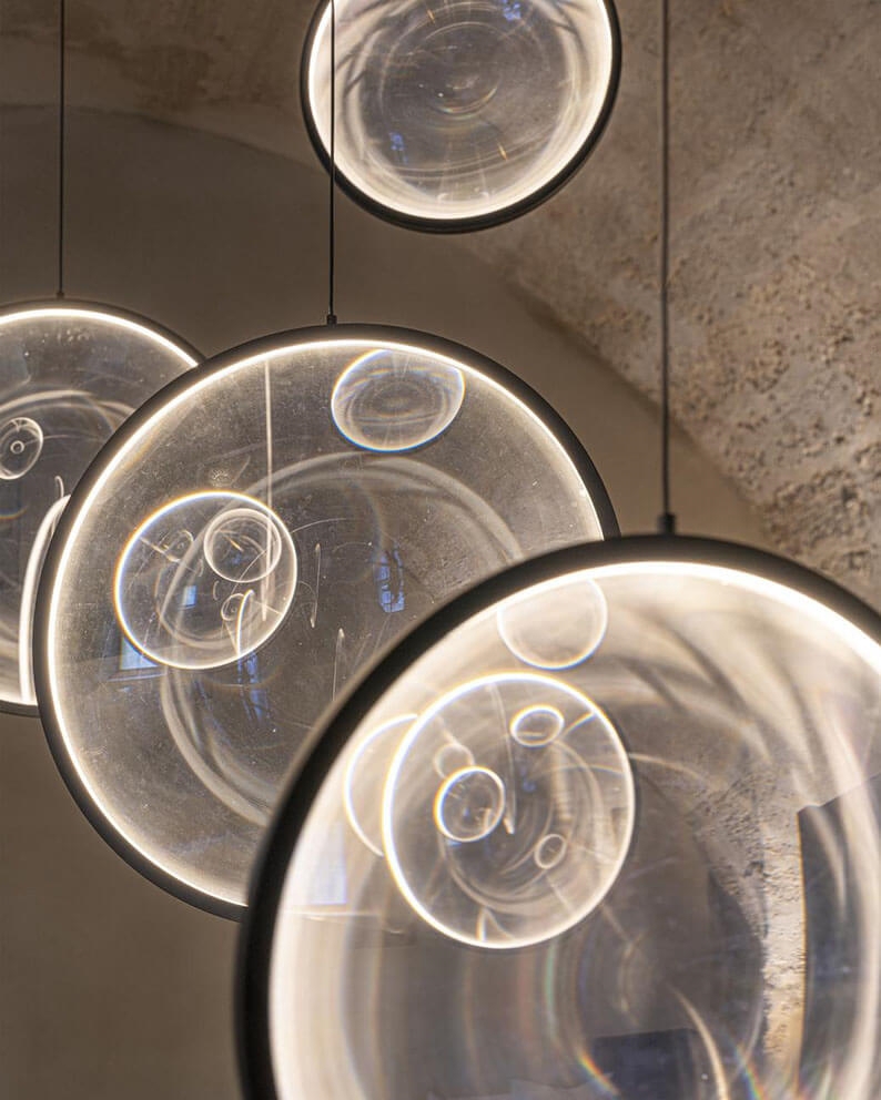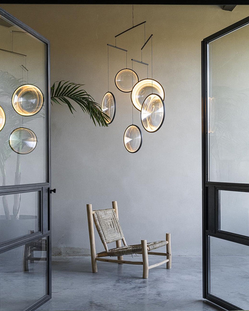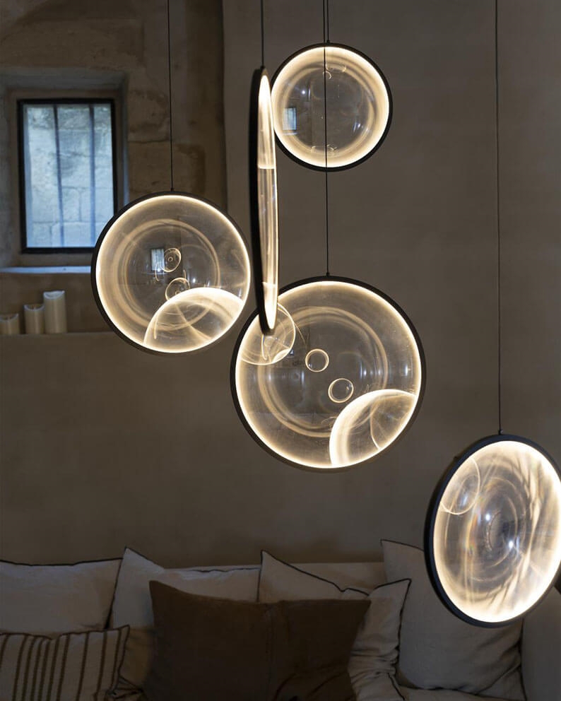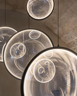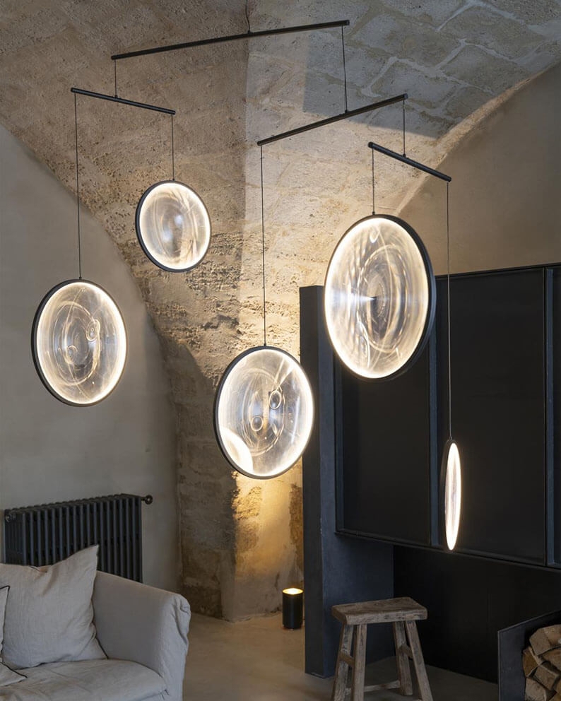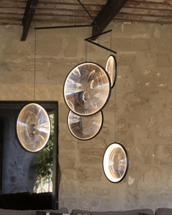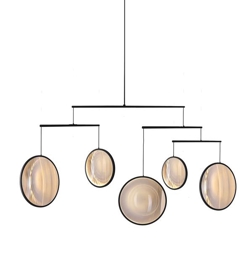 Die Pendelleuchte ist in Schwarz oder Weiß mit 3 oder 4 leuchtenden Scheiben und in Schwarz, Weiß oder Gold mit 5 leuchtenden Scheiben erhältlich.
