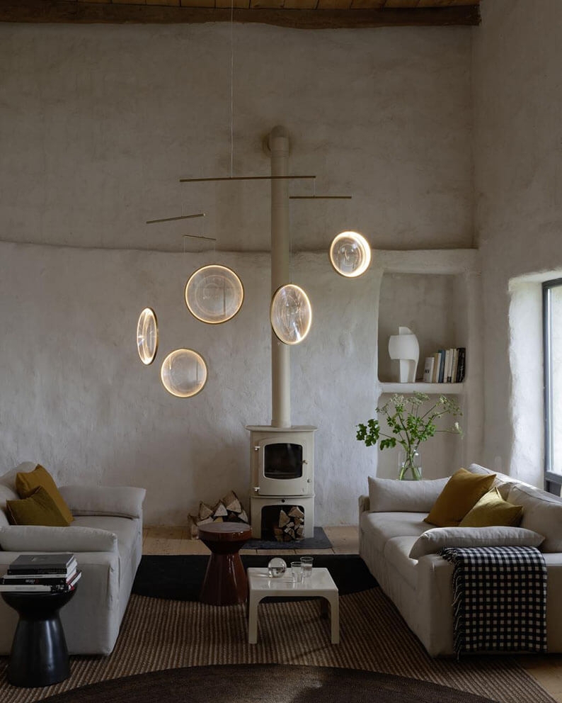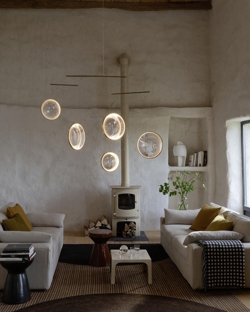 Die Pendelleuchte ist in Schwarz oder Weiß mit 3 oder 4 leuchtenden Scheiben und in Schwarz, Weiß oder Gold mit 5 leuchtenden Scheiben erhältlich.