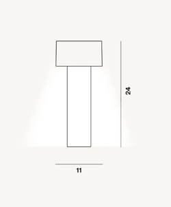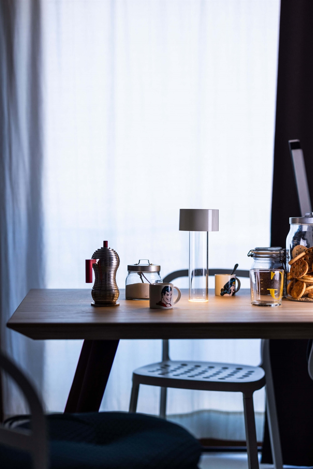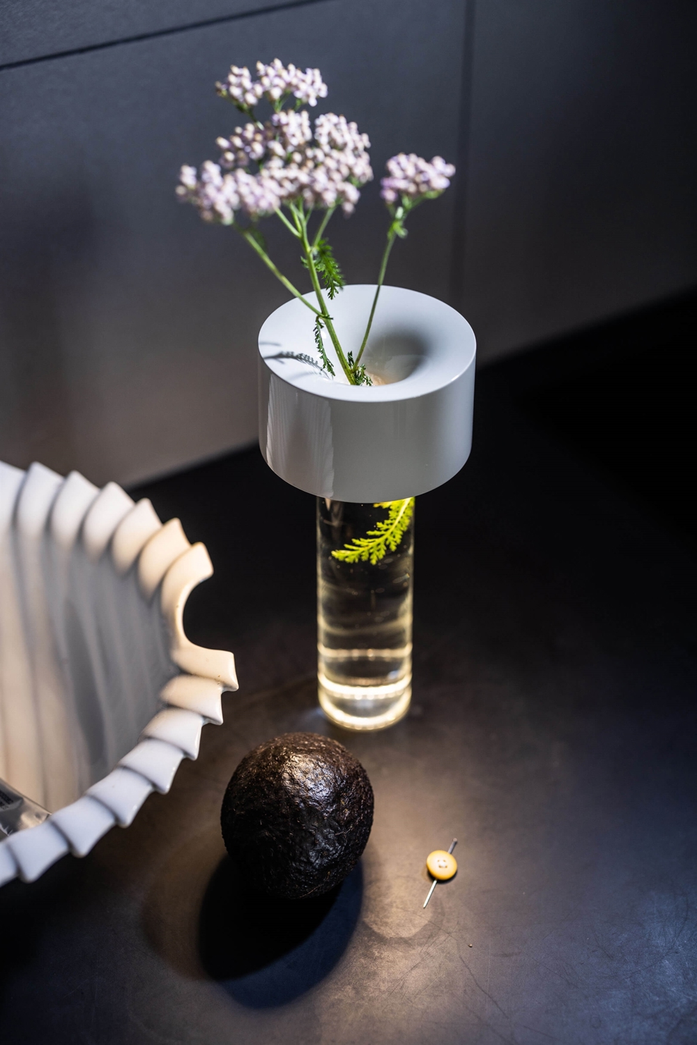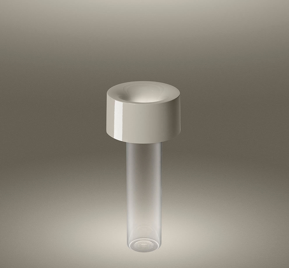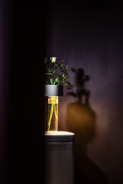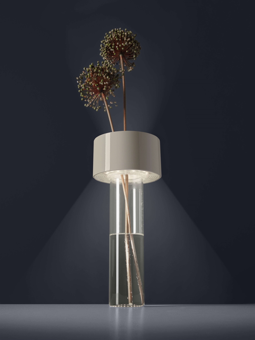 Batterielampe Fleur ist eine wiederaufladbare Tischlampe, die ein nach unten gerichtetes Licht hat und neben der Stimmungsbeleuchtung auch als Vase verwendet werden kann, die mit Wasser gefüllt werden kann. Die Lampe besteht aus einer zylindrischen Basis aus Glas und einem einfarbigen Oberteil mit der LED-Lichtquelle und ist in drei Stufen dimmbar. Sie kann 7 Stunden bei 100 Prozent, 9 Stunden bei 70 Prozent und 13 Stunden bei 30 Prozent leuchten.